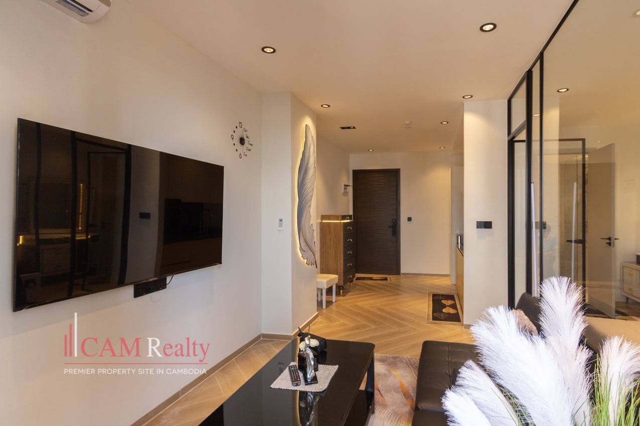 Modern style 1 bedroom serviced apartment for rent in BKK1 area – Phnom Penh. This luxury apartment is measuring 45 sqm and inclusive security guard 24/7, maintenance serviced, garbage collection fee, water usage 20m³ per month, Wi-Fi and TV cable, cleaning serviced 1 time per week and bed linen change 2 times per month as well. Plus, you also get complimentary access to its entertaining facilities(swimming pool, fitness center, steam & sauna).