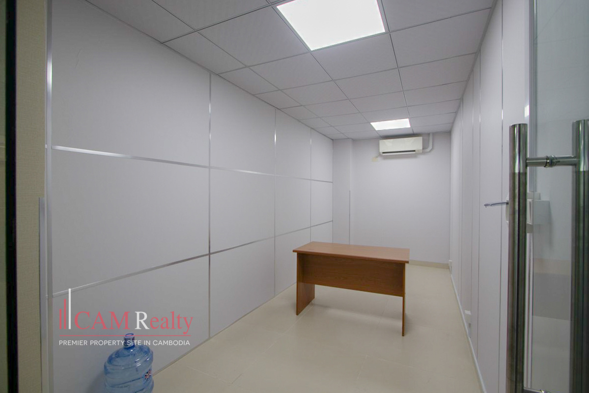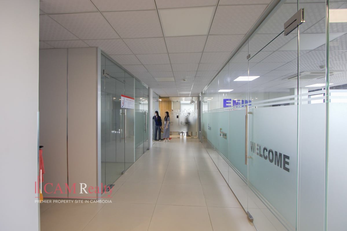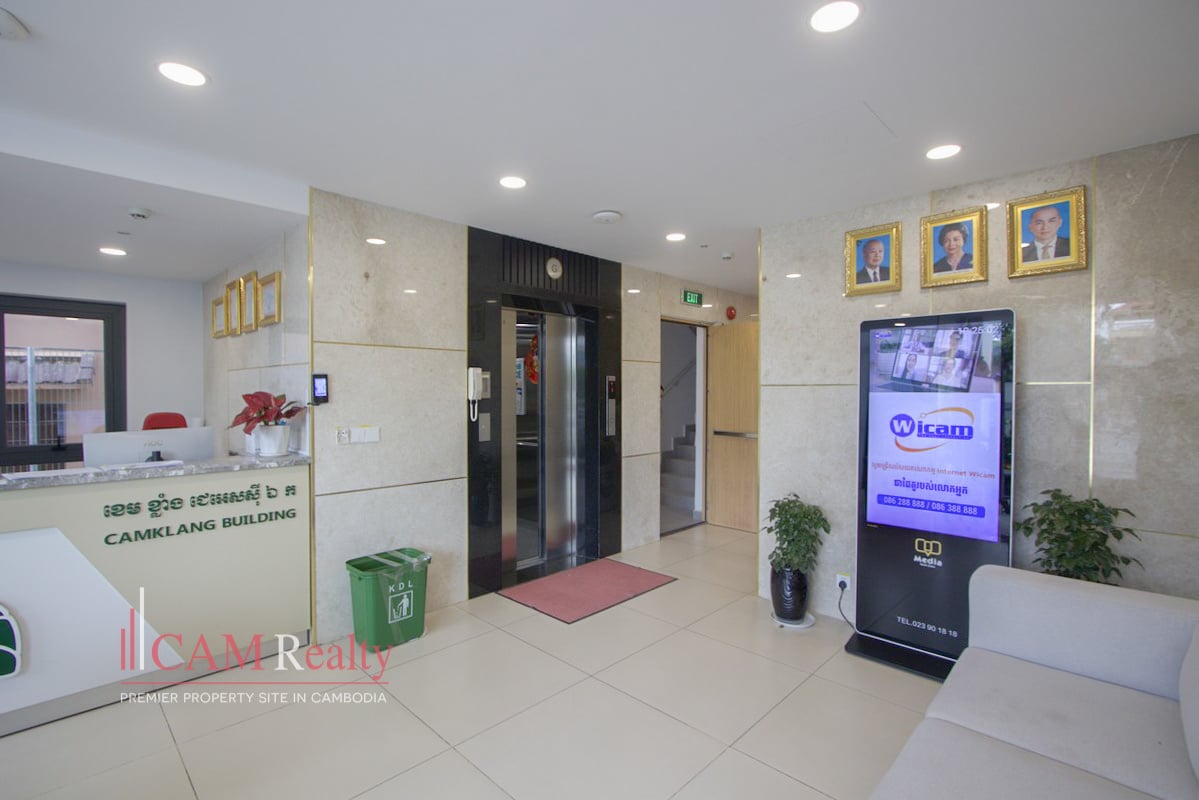 Secure modern Office Space for rent in Chbar Ompov. This prime location is situated along National Road 1. The building features a total of 11th available floors. This space is perfect for businesses seeking high-quality offices. The rental includes the Management Fee and water supply. It is an excellent choice for a professional corporate headquarters.