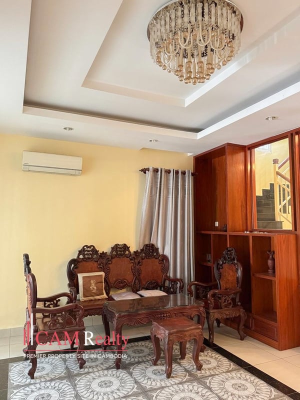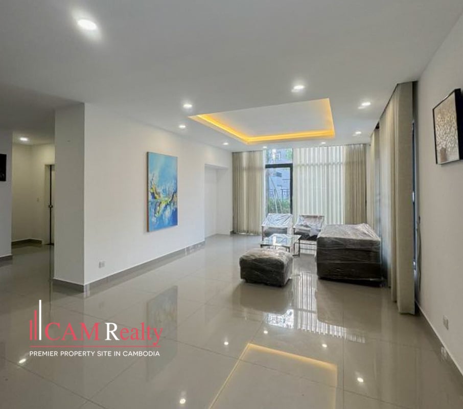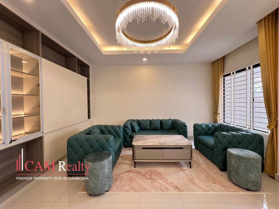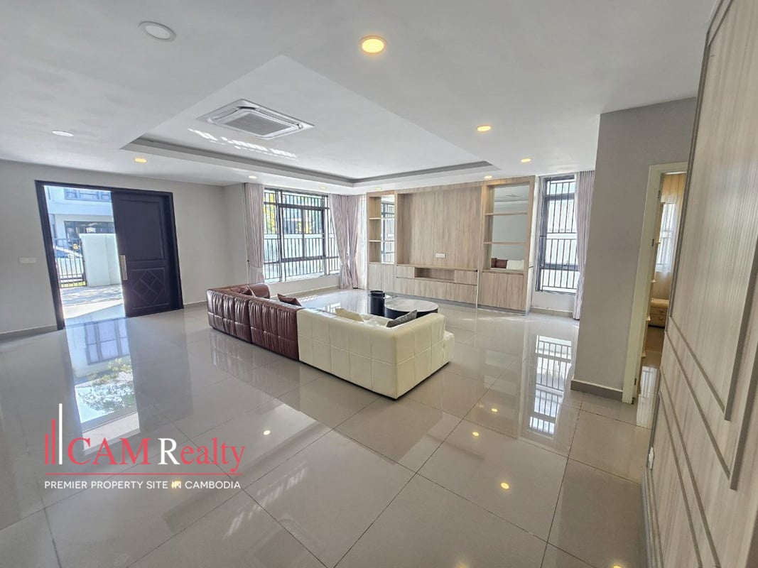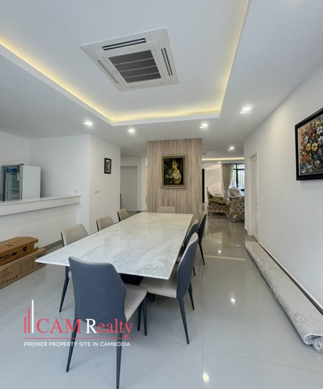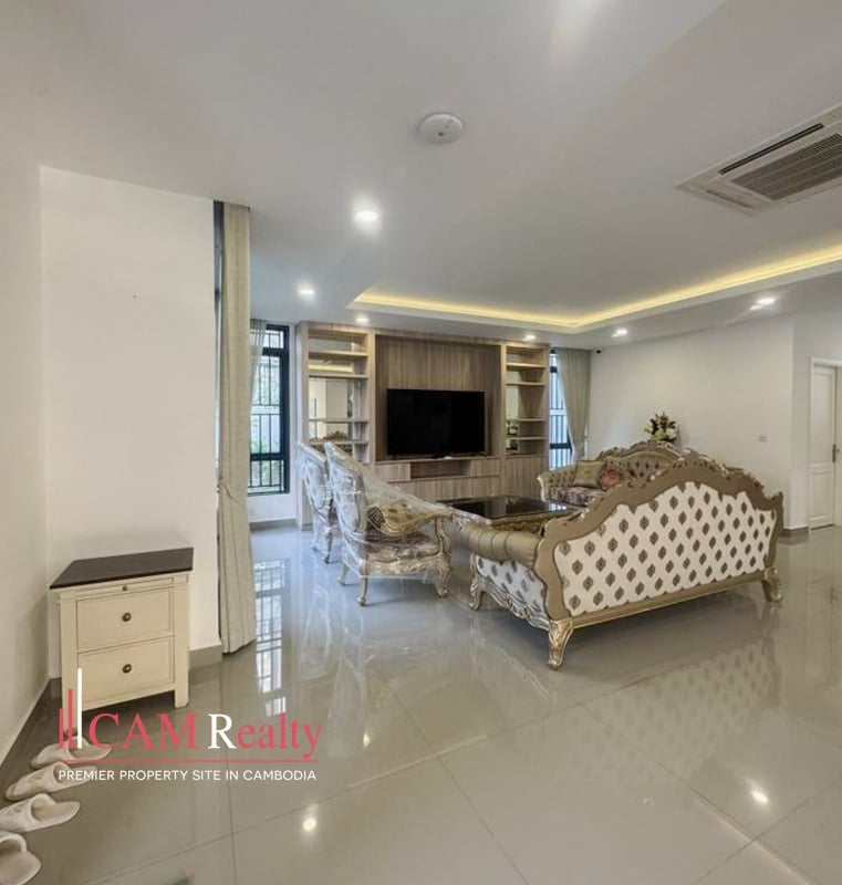 4 bedrooms twin villa for rent in Borey Phnom Penh Thmey Tuek Thla – Phnom Penh, The property is incredibly comfortable and quiet, located within a gated community with 24/7 security. It is fully furnished, ensuring a pleasant stay.