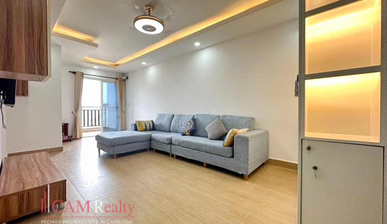 2 Bedrooms Condo For Rent in BKK3 – Phnom Penh. The apartment has a modern and minimalist design with white walls, wooden floors, and simple furniture. The living room is spacious and well-lit with large windows and recessed lighting. It features a comfortable sofa, a coffee table, and a dining table with 2 chairs. The…