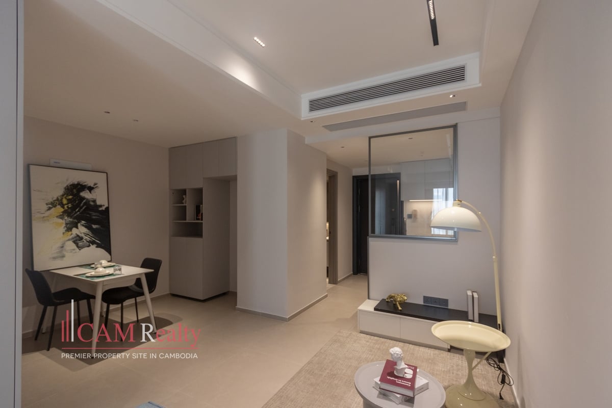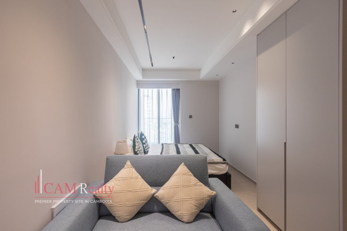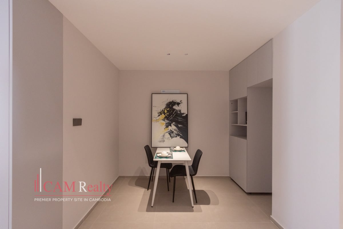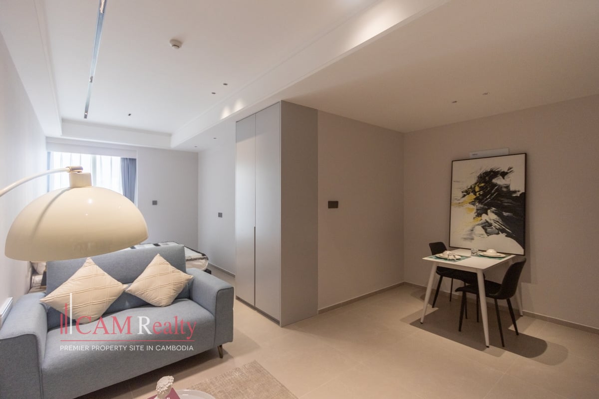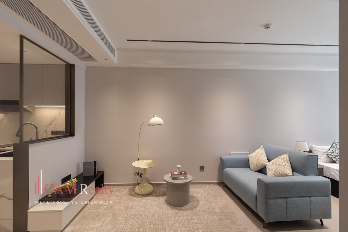 This Studio Room offers an exclusive residential living experience in Chroy Changvar. Located on the 12th floor, it enjoys stunning triple river views combined with a beautiful city skyline. The unit is fully furnished with modern and elegant interiors. It has a gross size of 56.63 sqm and a net living area of 46.51 sqm.
