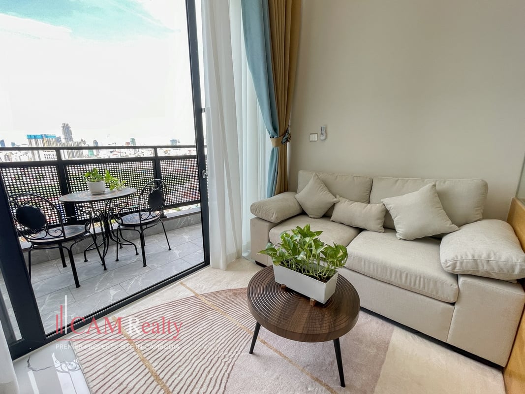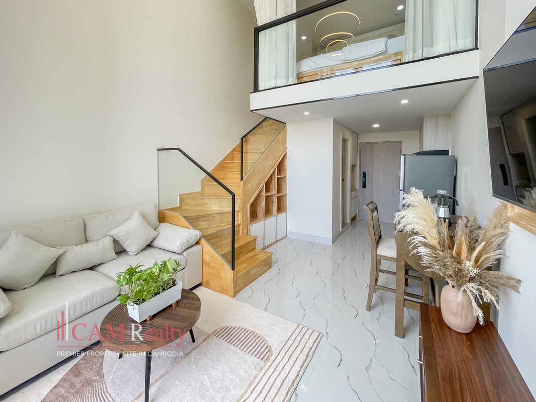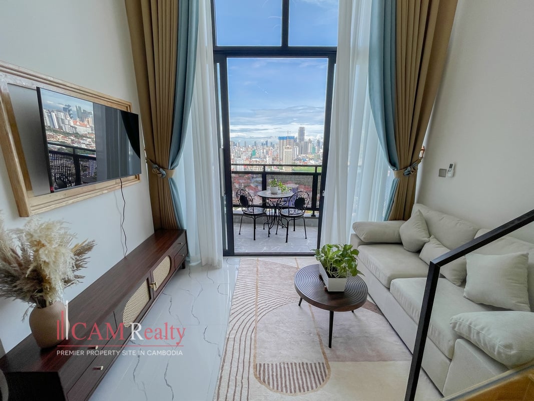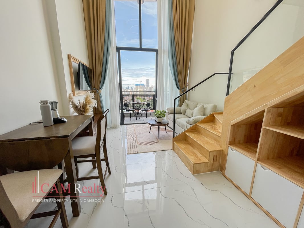 1 Bedroom Loft Condo For Rent in L Tower Boeng Tumpun. This fully furnished 1-bedroom loft condo in L Tower Boeng Tumpun blends modern style with functional space. Its high ceiling and private balcony create a bright, airy living environment.