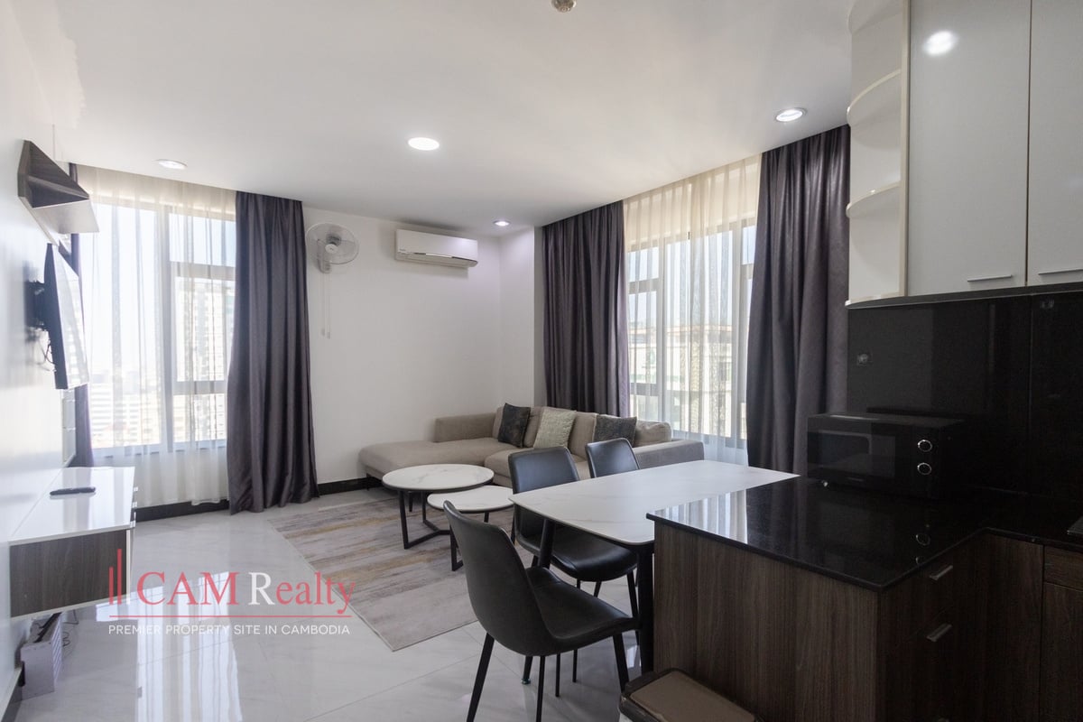 3 Bedroom Serviced Apartment For Rent in Southern Tonle Basak (Border BKK1). This modern serviced apartment locates in quiet, clean and green area at southern BKK1. This nice complex come with rooftop swimming pool, nice equipped gymnasium, steam & sauna room. You will spend less than 6 minutes from Independence Monument, less than 5 minutes from Aeon Mall.