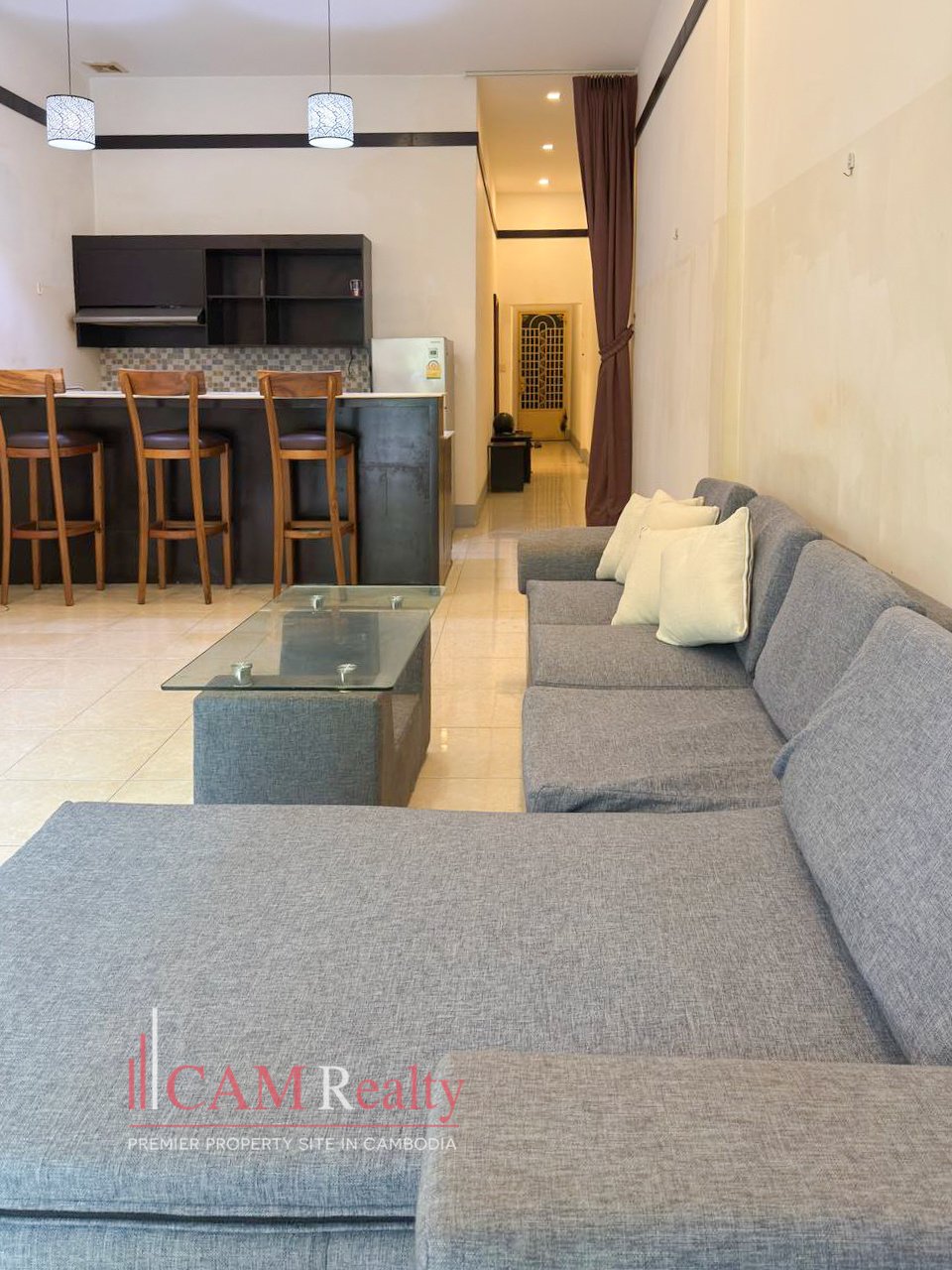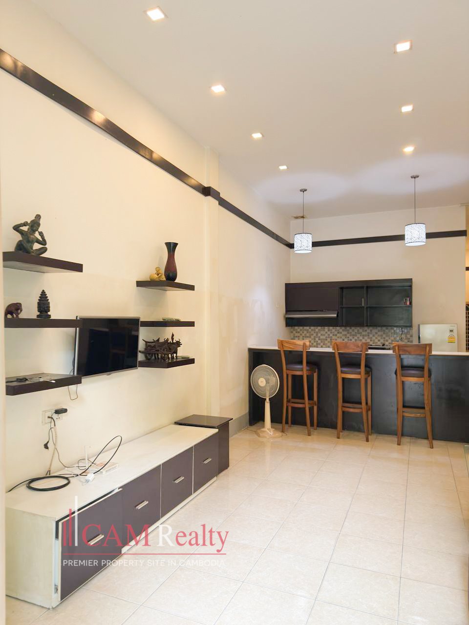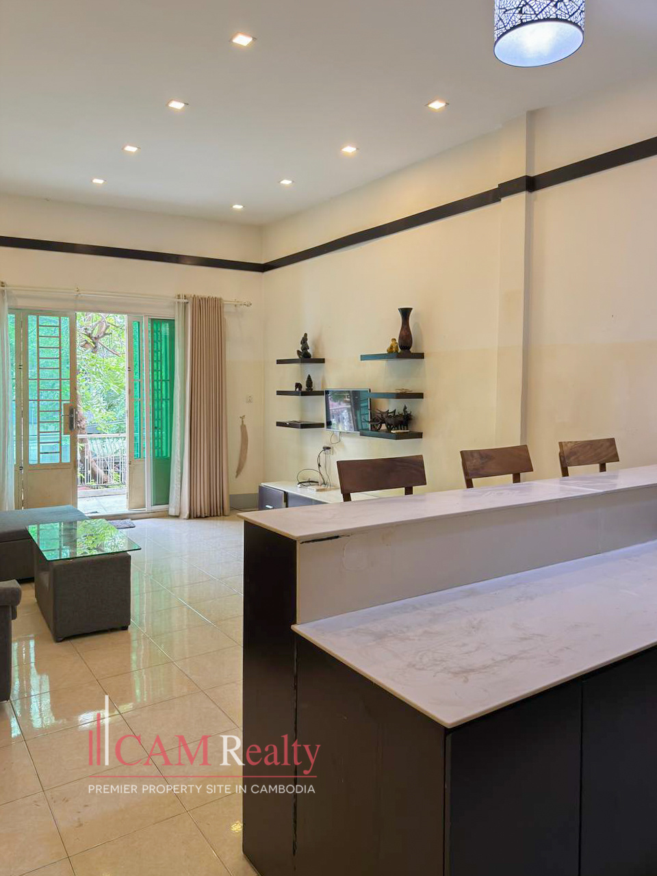 Modern style 2 bedrooms renovated house for rent in Riverside area – Phnom Penh. This townhouse is on the 3rd floor in a shopfront house in a convenient area. Just spend 5 minutes in a public garden, next to the banks, close to Wat Phnom and Night market, coffee shop, and mini-mart.