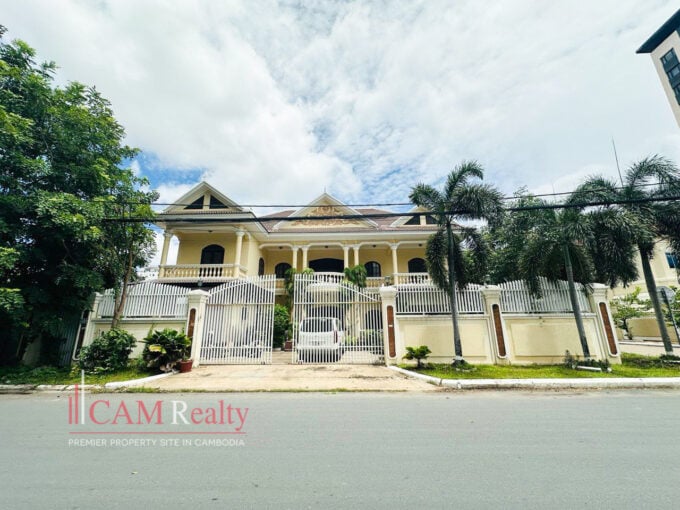 3 Bedroom Villa For Rent in Tuol Kork. This villa offers a spacious layout with 3 bedrooms and 6 bathrooms. It features a well-designed structure spread over 2 floors. The property sits on a large land size of 23m x 28m. The house itself measures 17m x 20.5m. Its south-east direction ensures good natural light. Suitable for both residential and office use.