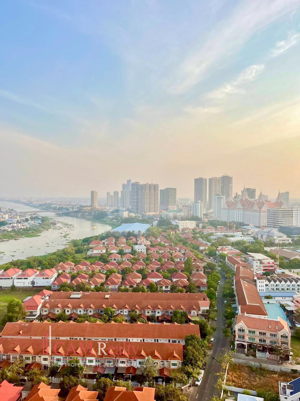 4 bedrooms condominium for rent at Rose Condo in Tonle Bassac – Phnom Penh. This 259.07 sqm apartment comes with a full fixed set of furniture. It comprises a spacious living room, with a wide balcony that overlooks both the city view and river view, a closed-door kitchen, 4 bedrooms, and 4 bathrooms.