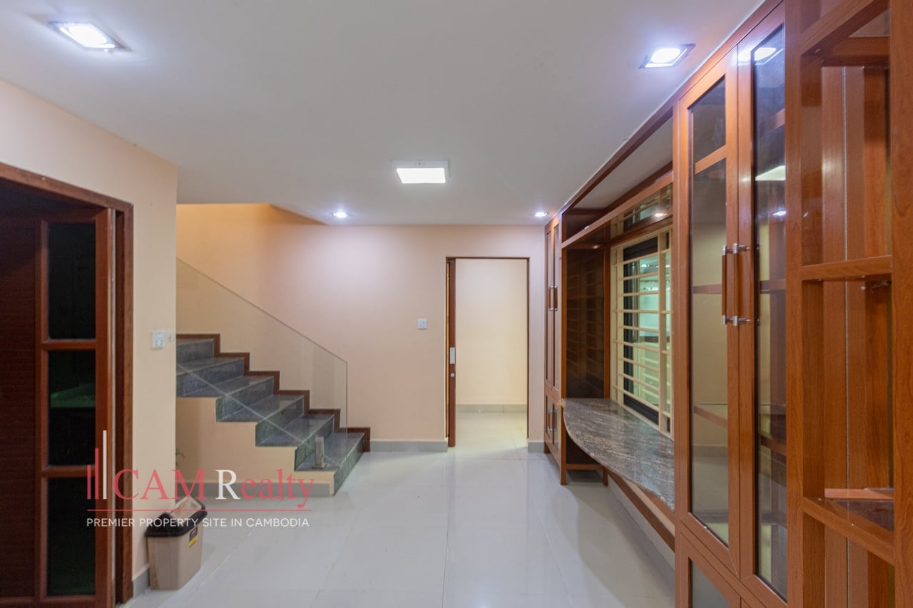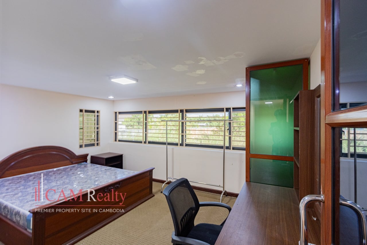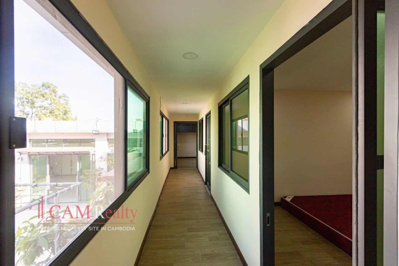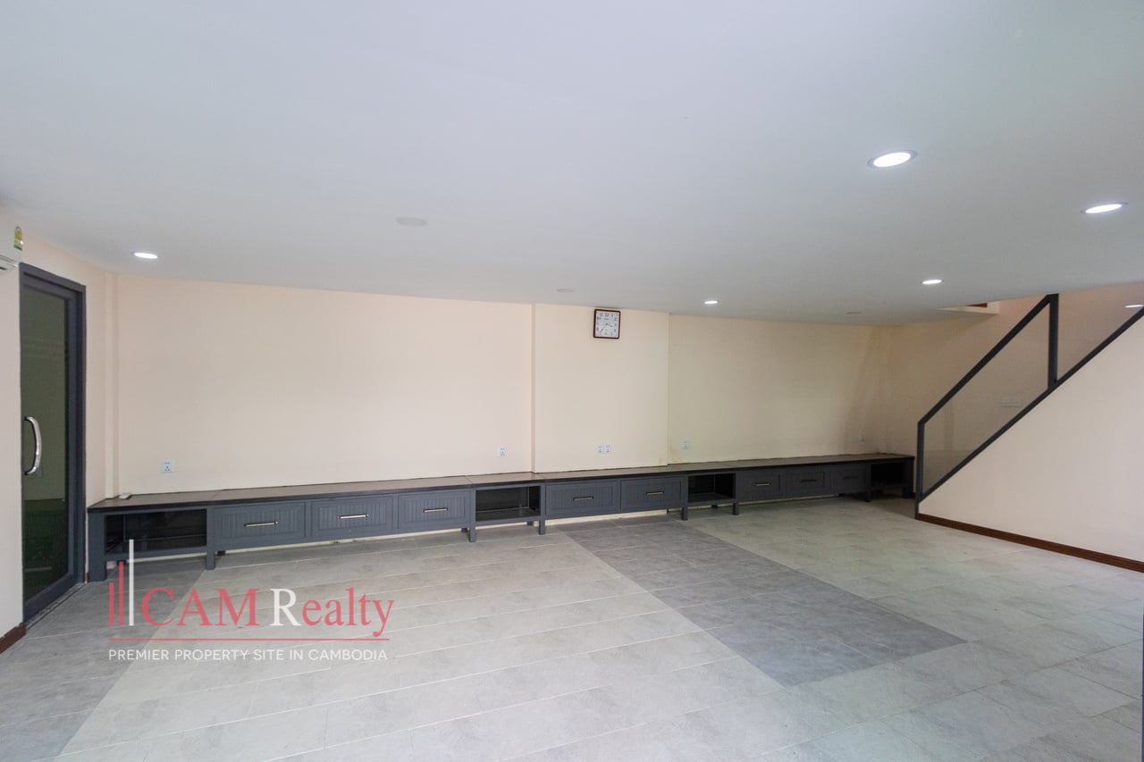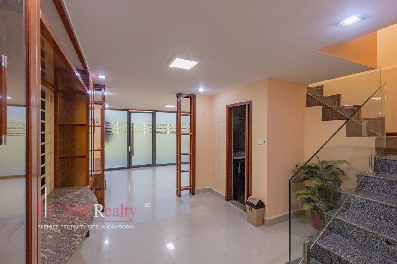 This villa is located in Sangkat Veal Sbov, Khan Chbar Ampov. The property is designed for residential or office use. It features a modern two-storey structure. The house offers five spacious bedrooms. There are two bathrooms with practical layouts. Two living rooms provide flexible living and working space.