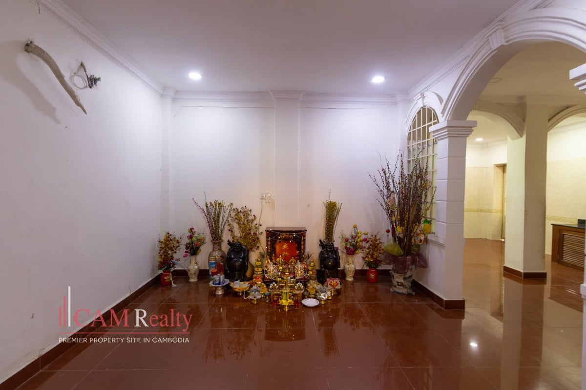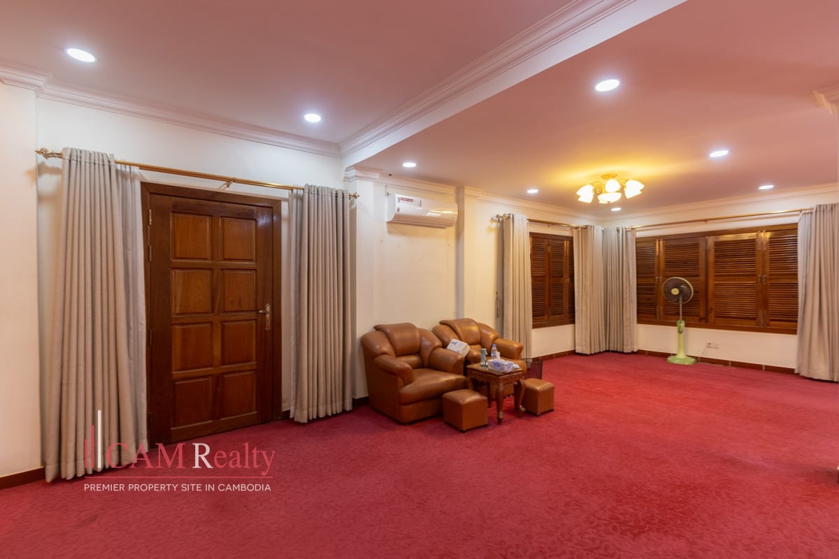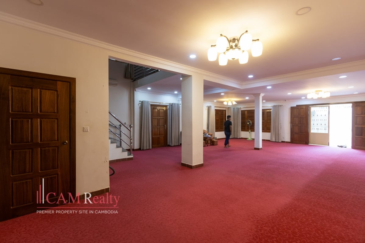 An impressive Single Villa is available for rent in the prestigious Daun Penh Area. This property is excellent for a corporate office or large family residence. It features five expansive bedrooms and six total bathrooms. The villa is offered unfurnished, allowing for complete tenant customization. This is a rare opportunity for a large, private space downtown.