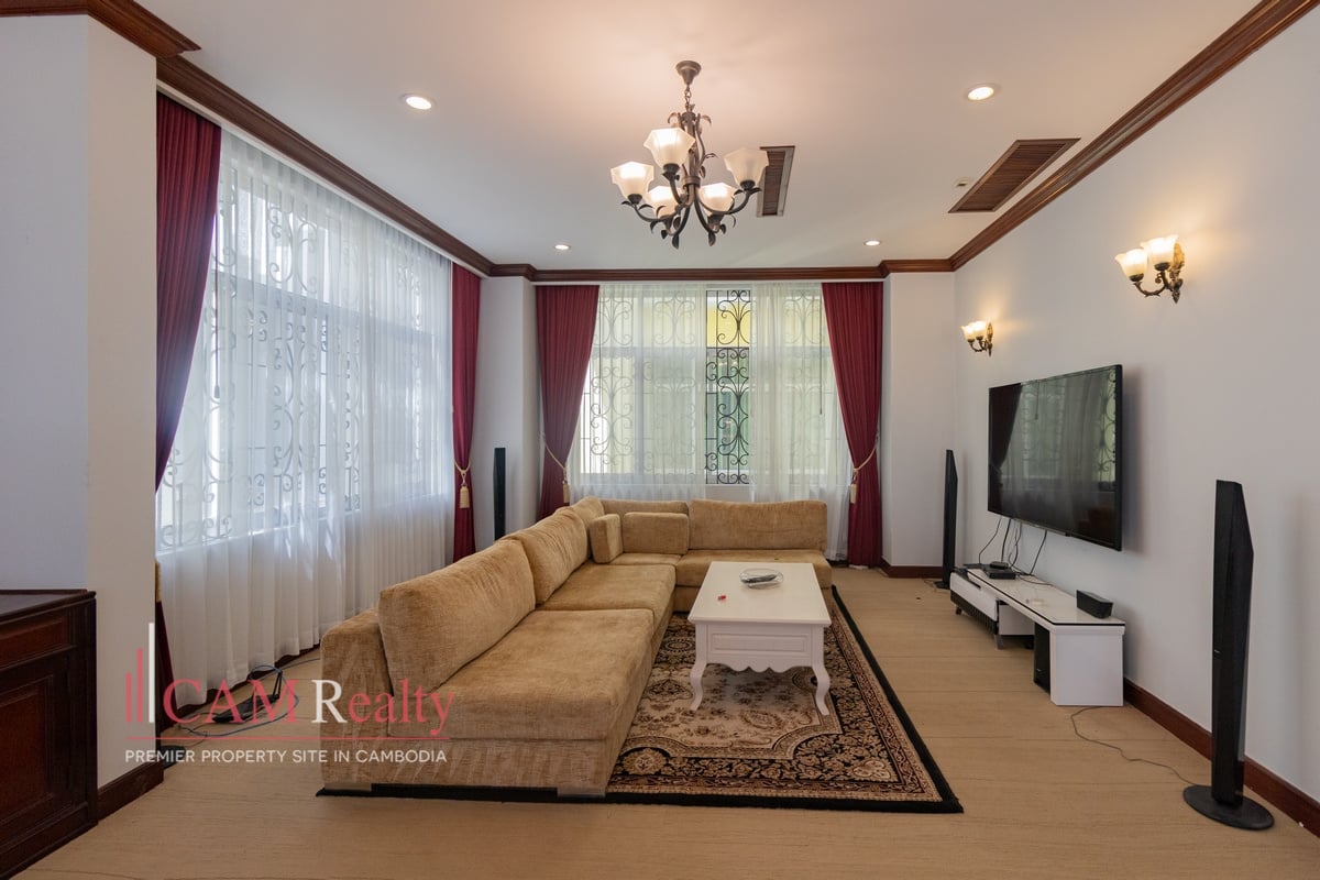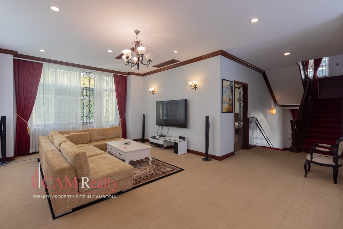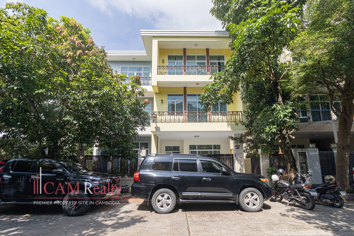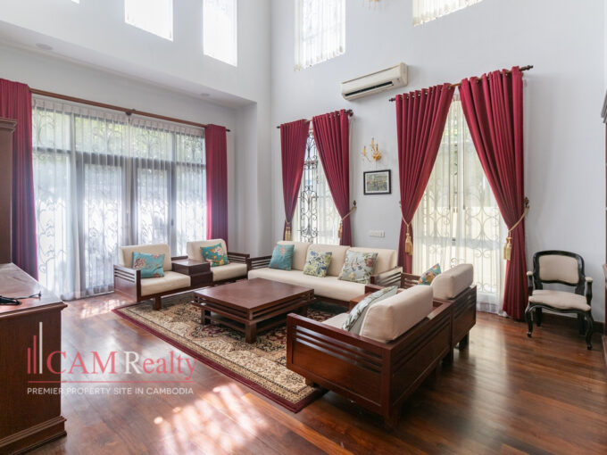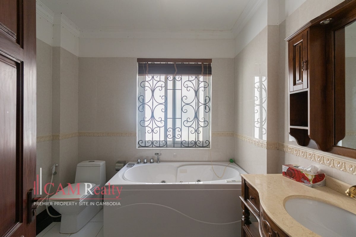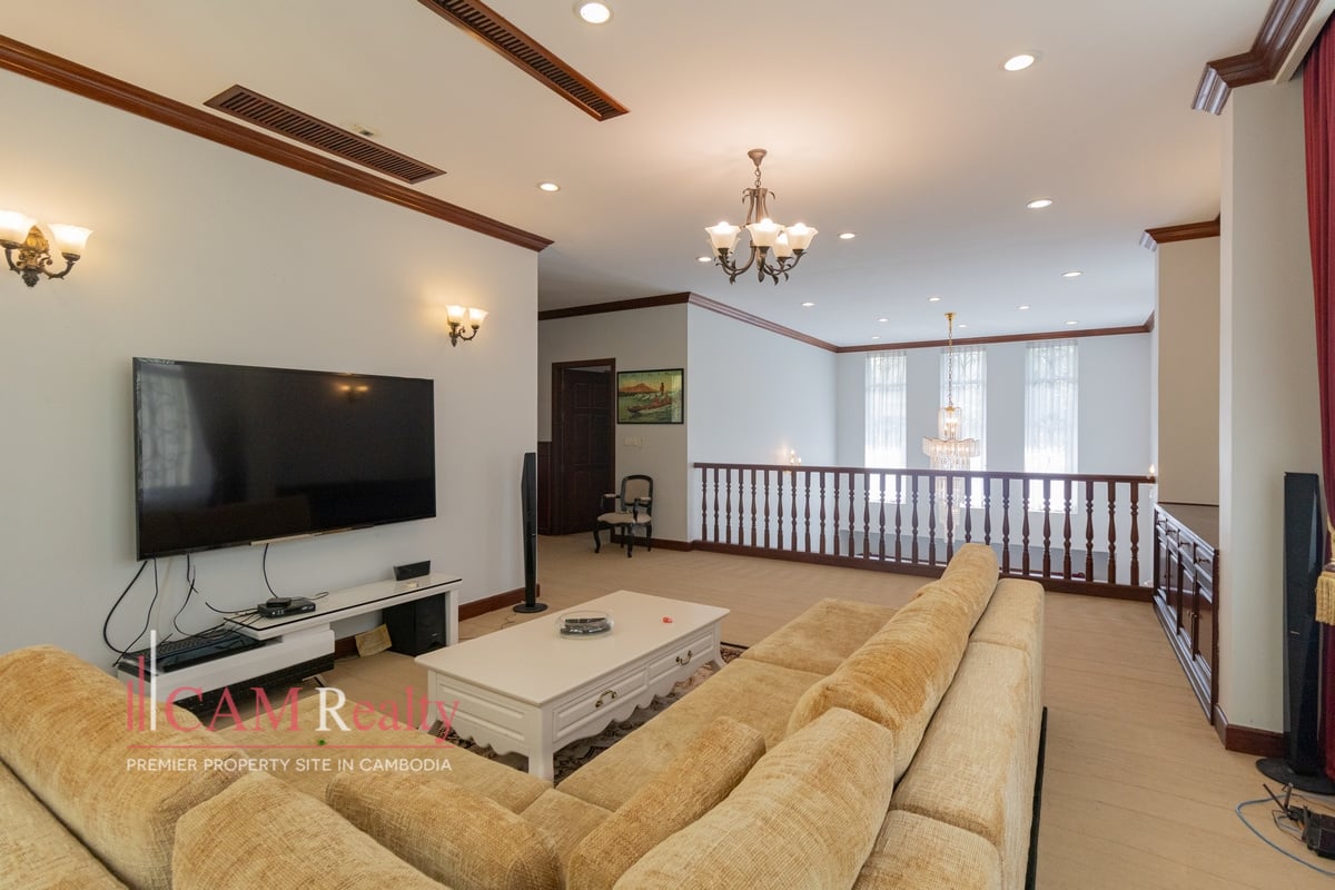 6 Bedroom Villa For Rent in Elite Town (Diamond Island). This spacious villa offers a modern lifestyle in Phnom Penh’s prestigious Diamond Island. It features six bedrooms, eight bathrooms, and three living rooms. The property is partly furnished and designed for comfort and functionality (Some Furniture will Be Remove). A rooftop terrace provides extra space for relaxation or gatherings.