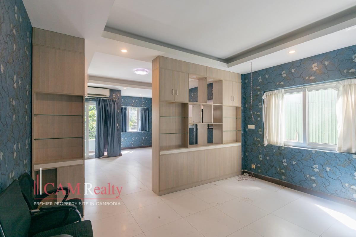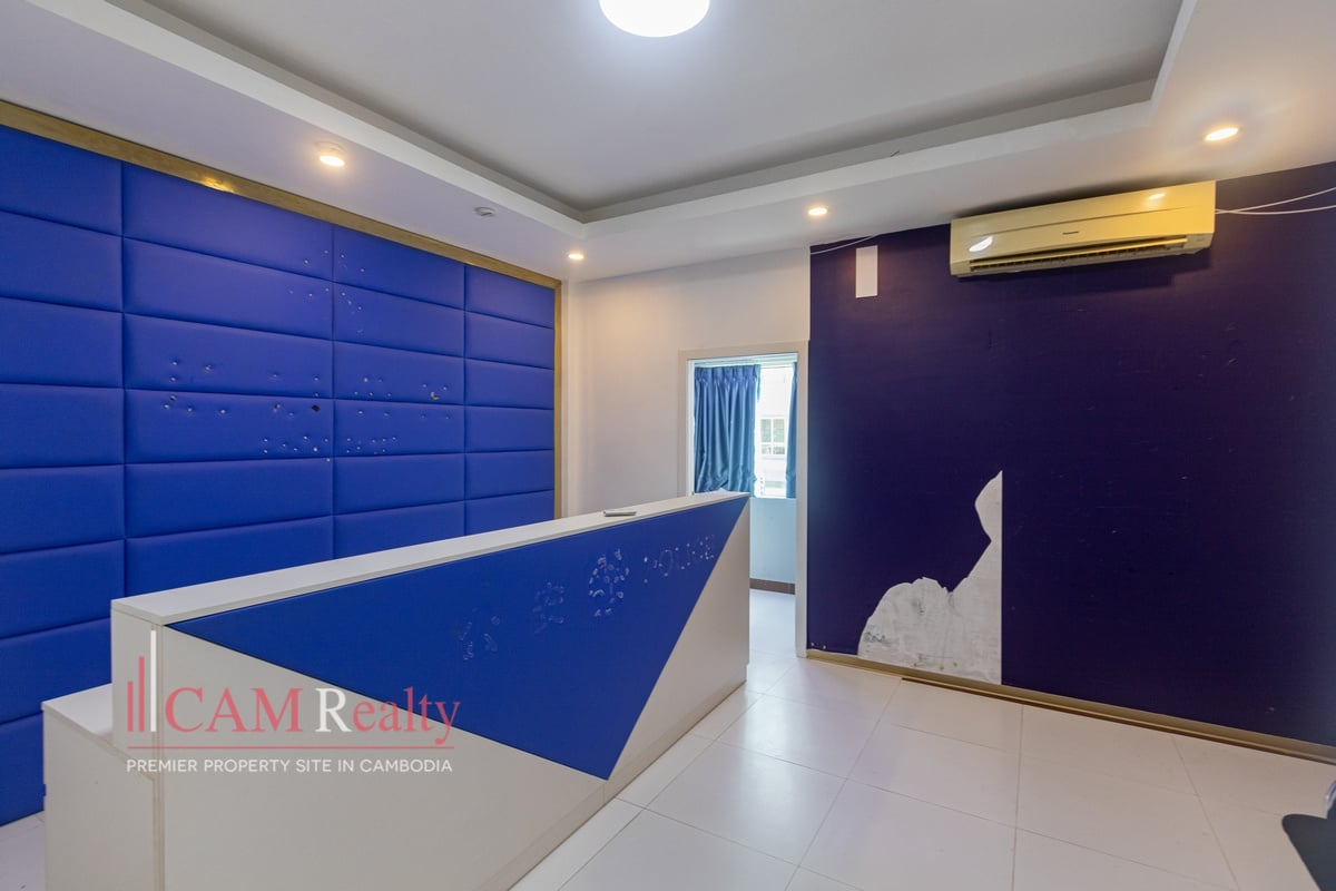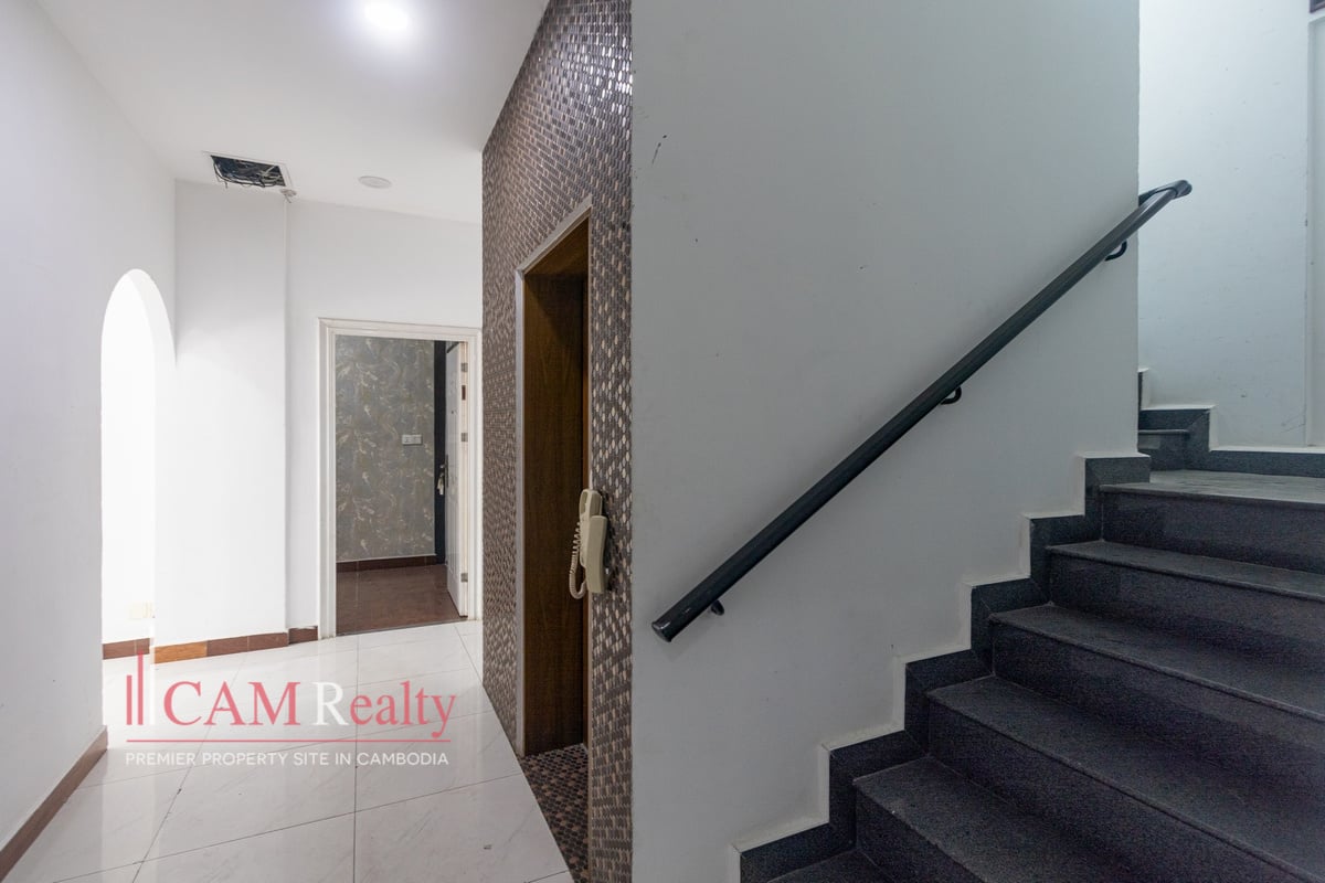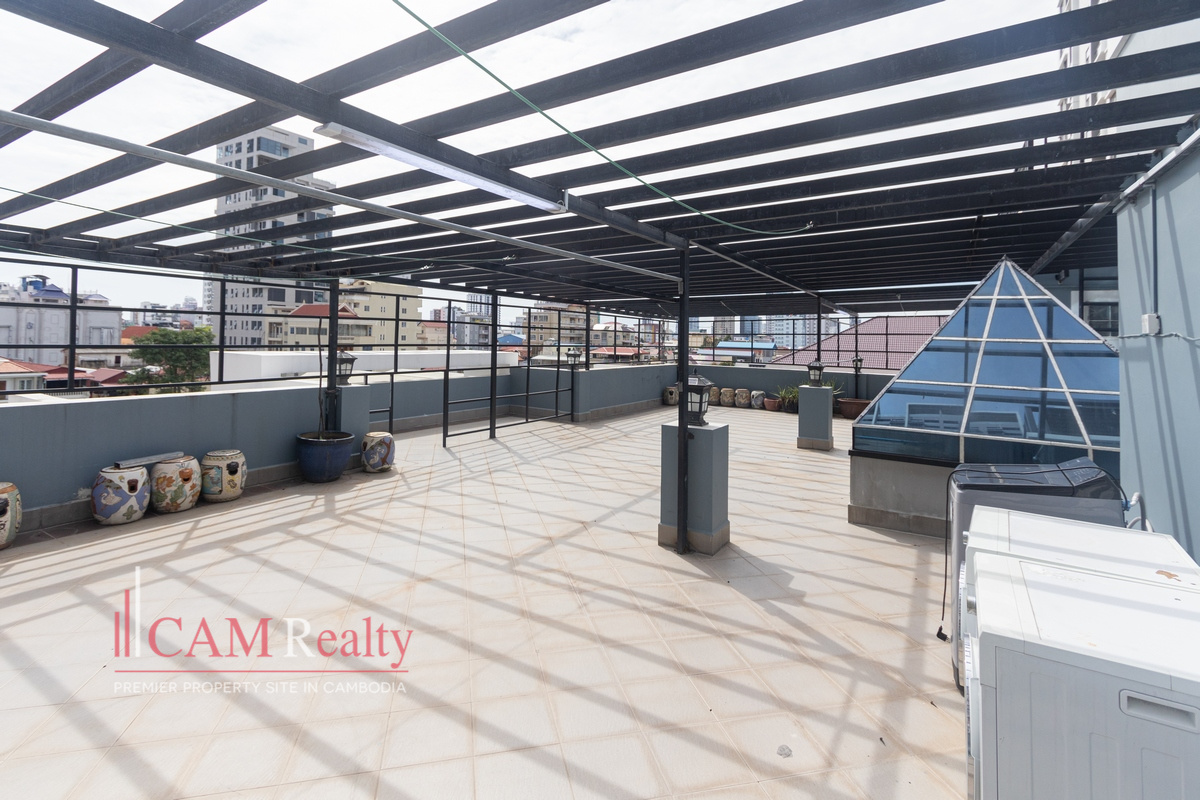 Mixed-use building (apartment and office) for rent in BKK3 area – Phnom Penh. This mixed-use building can be used as an NGO office or a company head office for a small group of workers. This house has 5 floors and is composed of 15 rooms, including 3 offices and 1 5-bedroom penthouse. A frontal yard is for parking that fits from 6 to 8 cars.