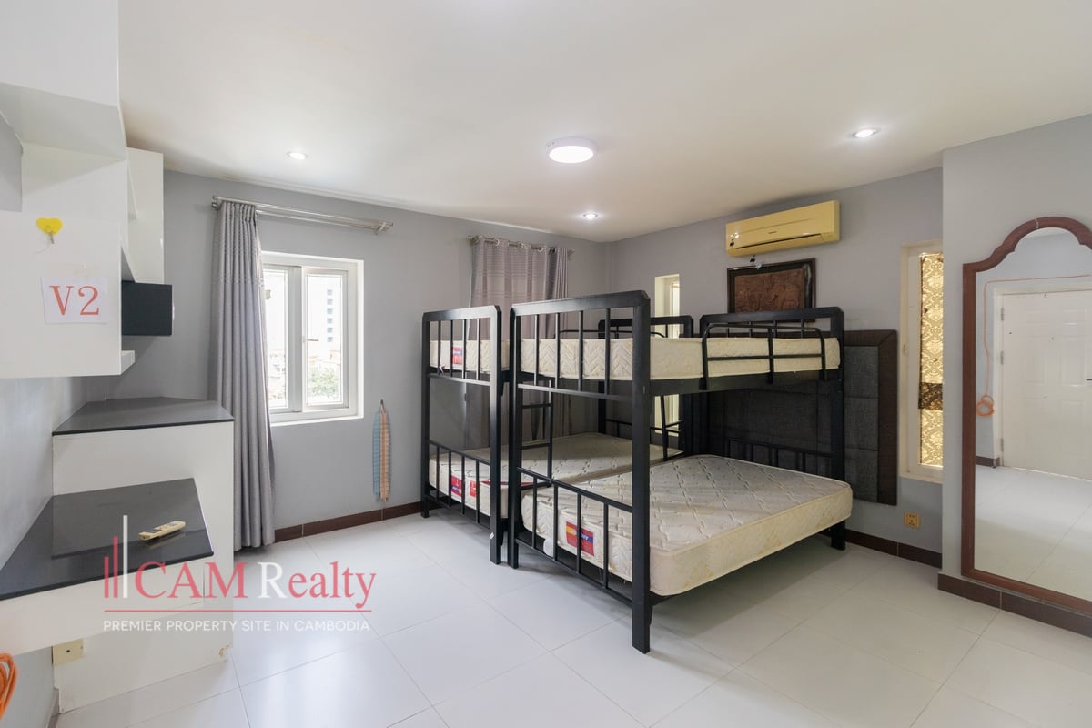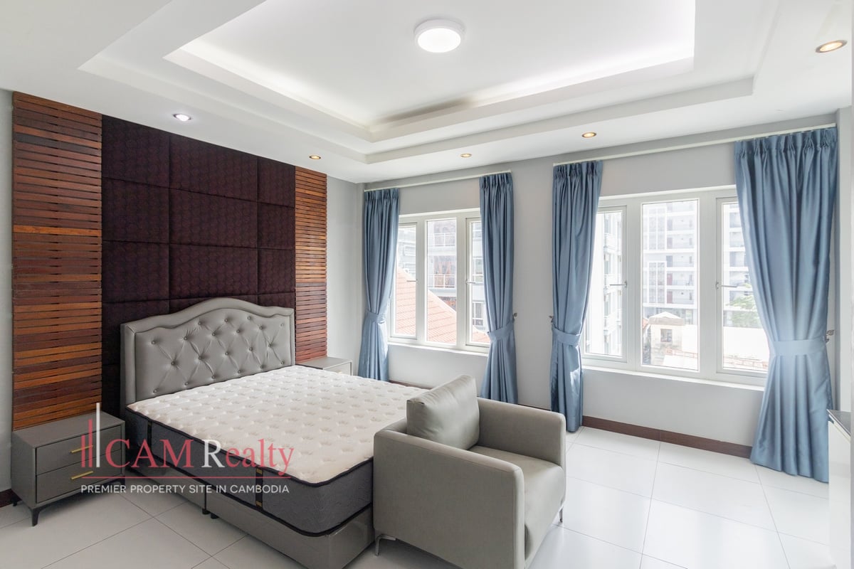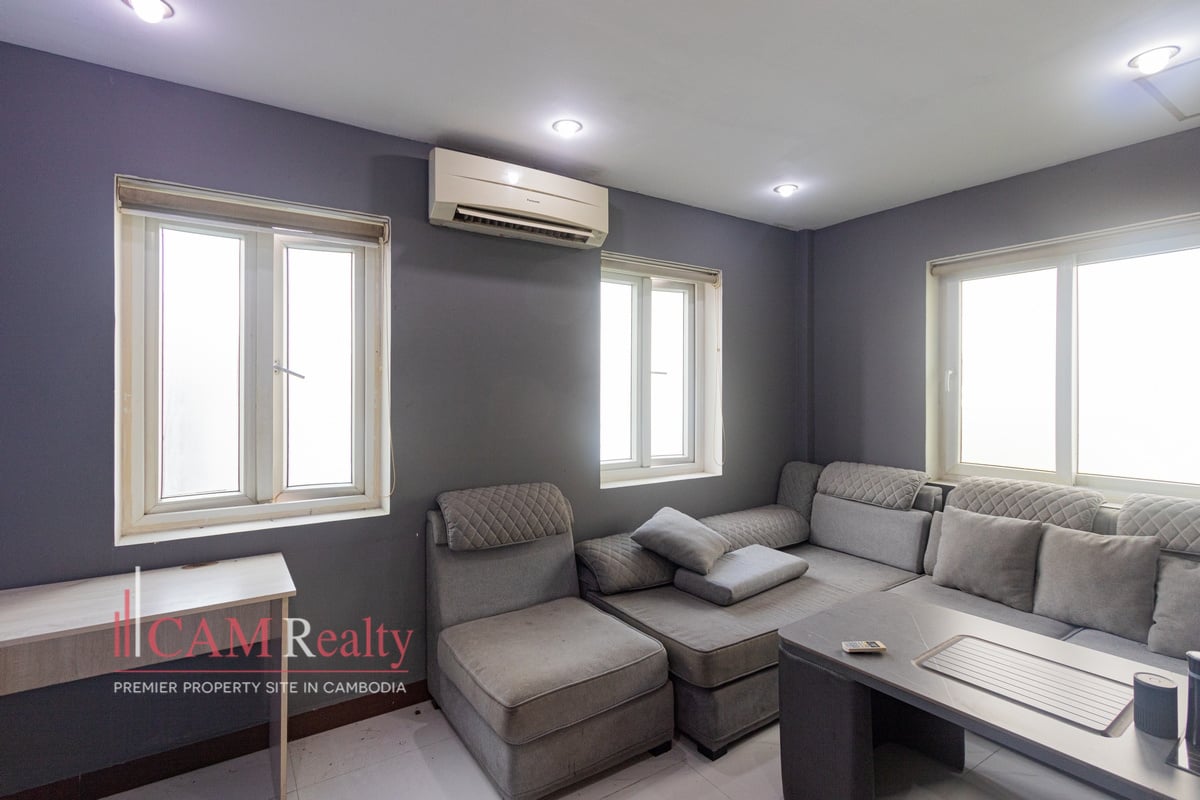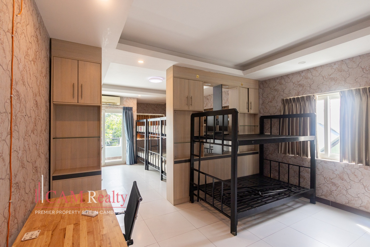 Mixed-use building (apartment and office) for rent in BKK3 area – Phnom Penh. This mixed-use building can be used as an NGO office or a company head office for a small group of workers. This house has 5 floors and is composed of 15 rooms, including 3 offices and 1 5-bedroom penthouse. A frontal yard is for parking that fits from 6 to 8 cars.