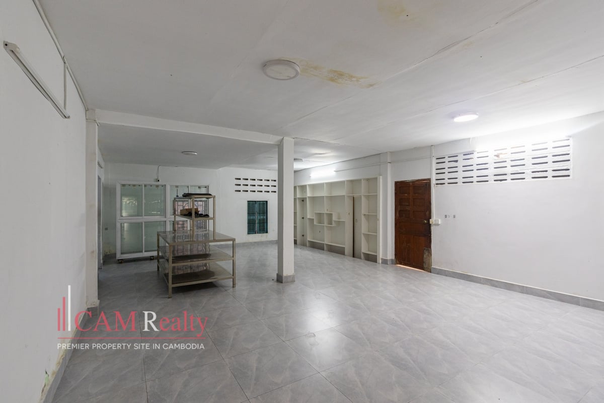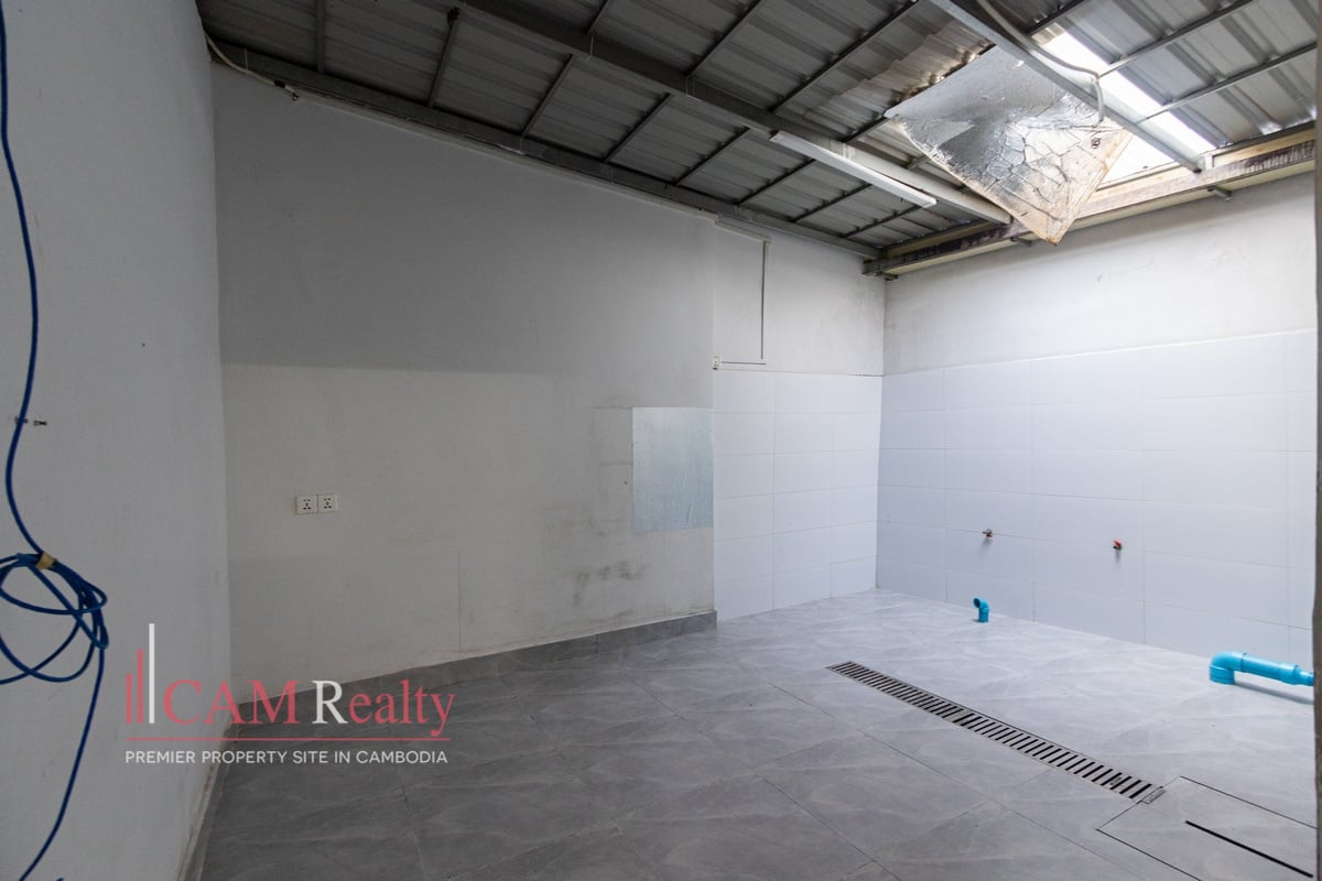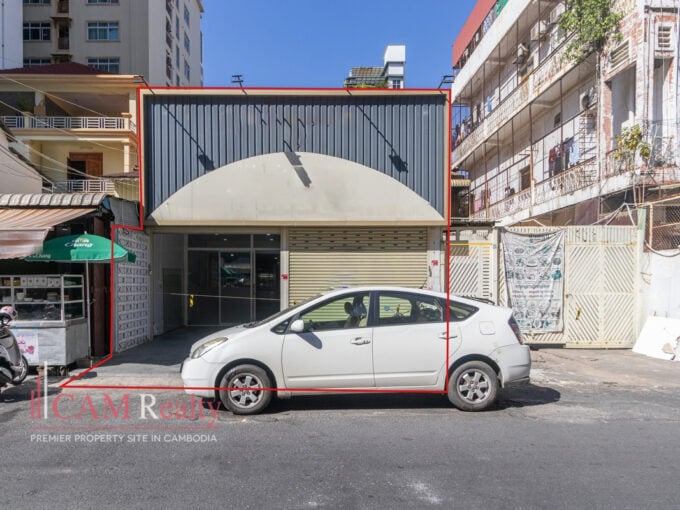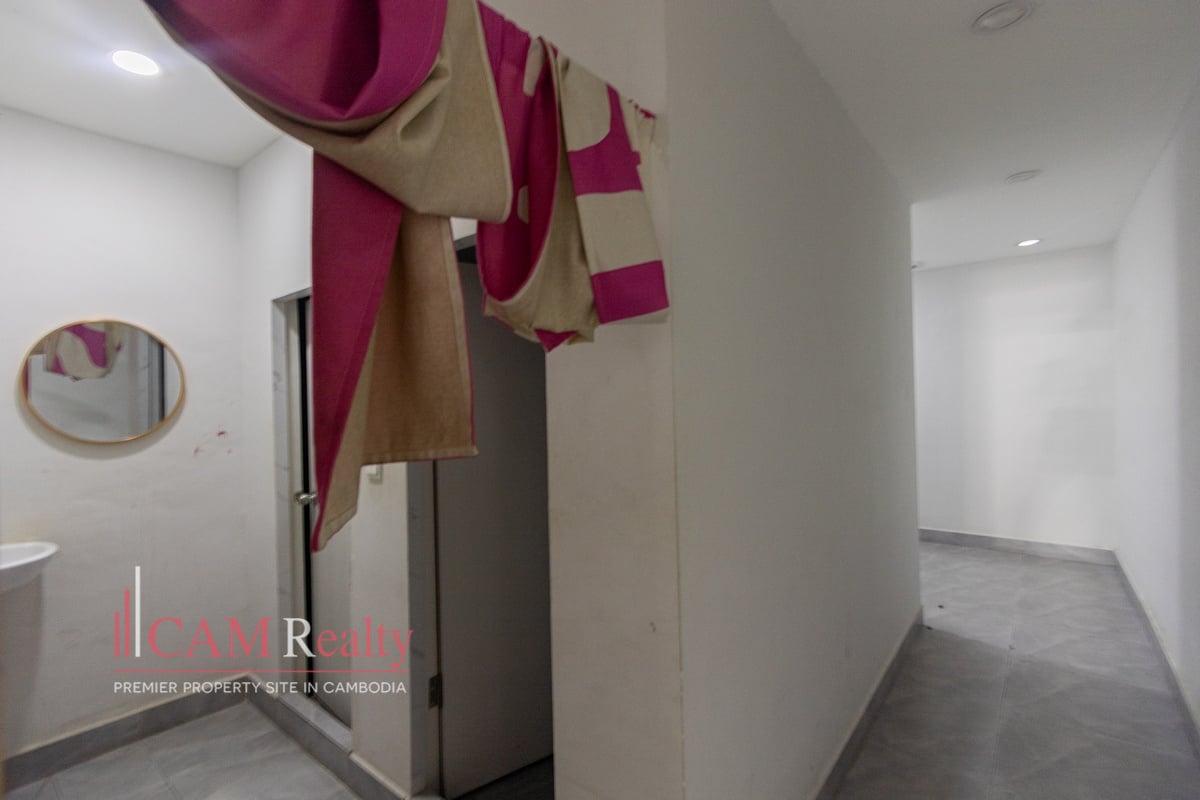 Commercial Space For Rent in BKK1. It features a wide layout suitable for retail or service businesses. The property includes two rooms and two bathrooms. The open floor plan supports flexible shop setups. The unit is unfurnished, allowing full customization. The frontage faces south for good daylight. The building has one floor and a long interior depth. Motorbike parking supports daily customer flow. The lease term is two years with a negotiable construction period.