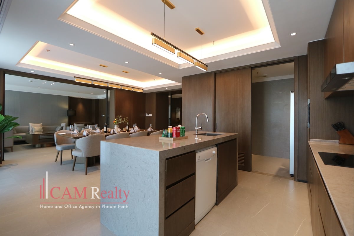 Expansive 4 bedrooms premier penthouse for rent in Daun Penh area – Phnom Penh. This 457 sqm penthouse apartment is on the 17th and 18th floor and comprises 2 floors – on the 17th floor features a living room, a spacious kitchen with a range hood, electric hops, a dishwasher, 3 countersinks, an island desk, and an 8-seater dining room, 1 restroom, 1 study room, as well as 2 en-suite bedrooms that contains an own lounge set and a smart TV – one of the en-suite comes with a bathtub. Meanwhile, on another floor fits a full living room with a complete lounge set, an en-suite master bedroom that contains a lounge set with a smart TV, a walk-in closet, and another en-suite bedroom. In addition, there is also a large private terrace that overlooks the city view and the property facilities.