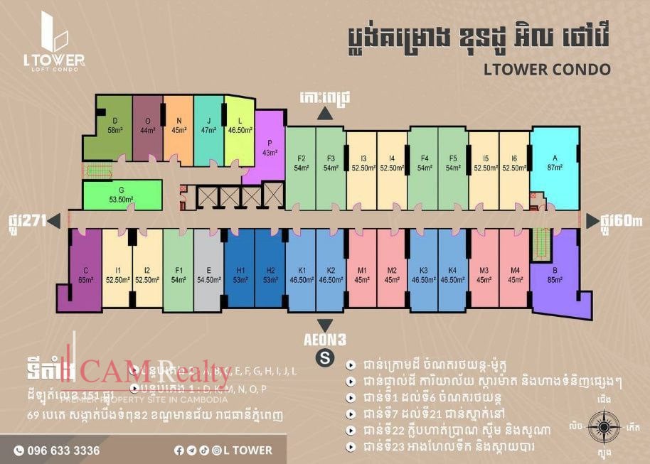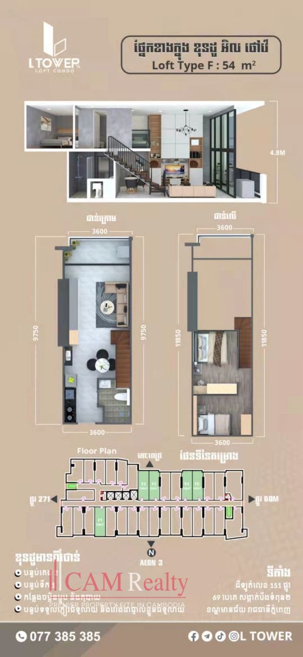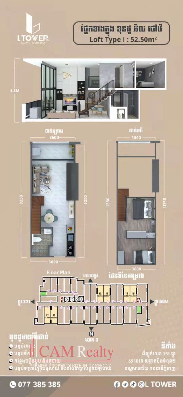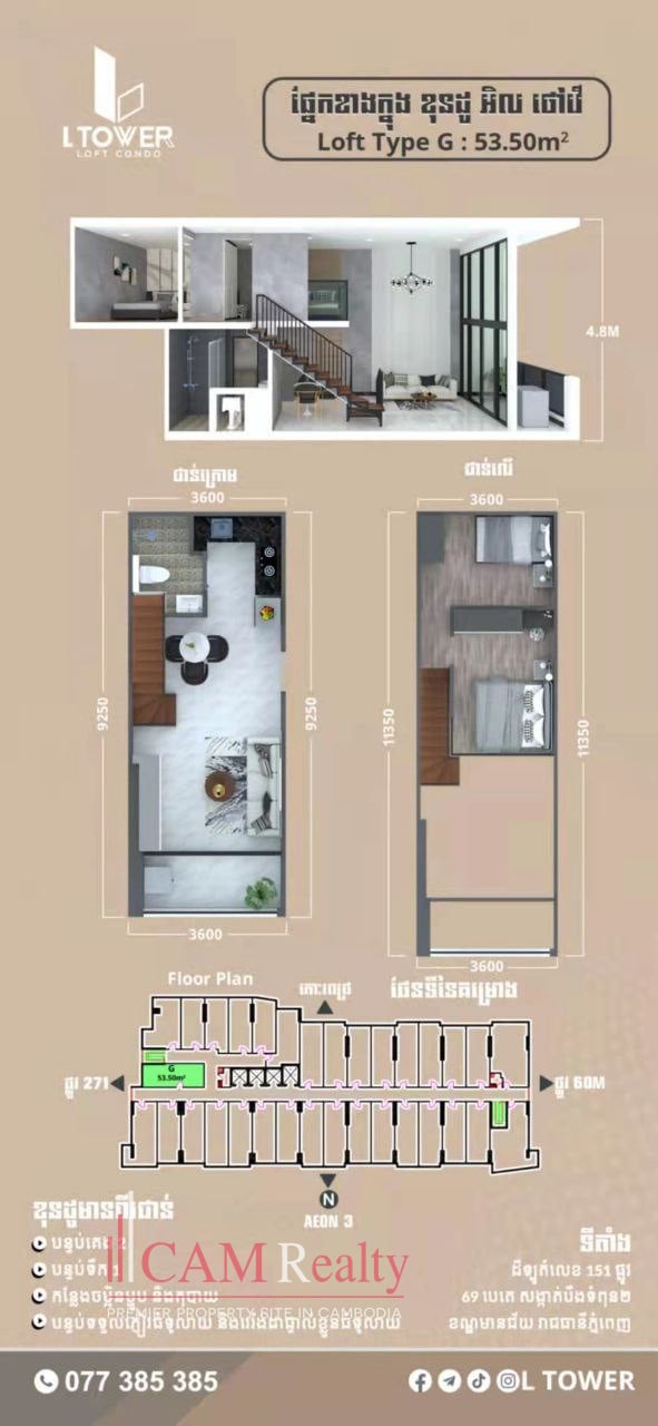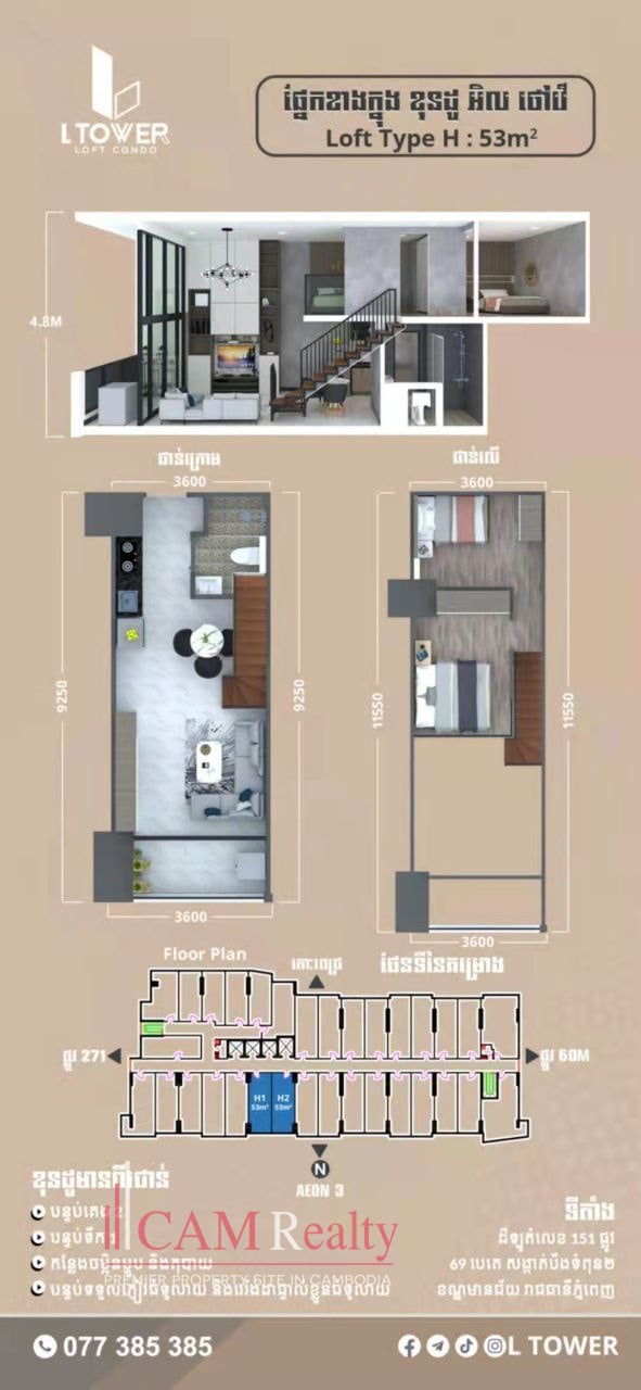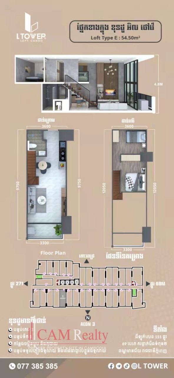 2 Bedroom Loft Condo For Sale in L Tower Boeng Tumpun. Located in Boeng Tumpun, Khan Mean Chey, Phnom Penh — close to Chip Mong 271 Mega Mall, AEON Mall Phnom Penh, and just 15 minutes from Techo International Airport (KTI).