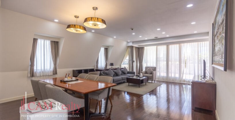 3 Bedroom Penthouse Serviced Apartment For Rent in Daun Penh. Located in Sangkat Wat Phnom, Khan Daun Penh, Phnom Penh — within walking distance to Lycée Français René Descartes (LFRD), EXCHANGE SQUARE, Vattanac Capital, the French Embassy, and the U.S. Embassy.