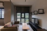 The living area is equipped with a comfortable sofa and a modern television for entertainment. The kitchen is outfitted with a microwave, sink, exhaust hood, and electric stove, allowing for easy meal preparation. The bedroom contains a queen-sized bed, providing a cozy and restful sleeping environment. The bathroom features a glass-enclosed shower, separating the wet and dry areas. Additionally, a smart bidet toilet is installed for added convenience.