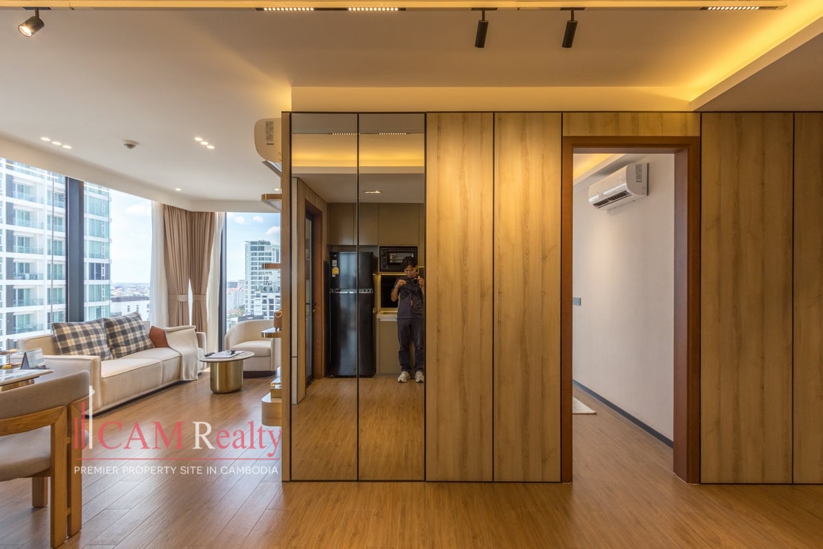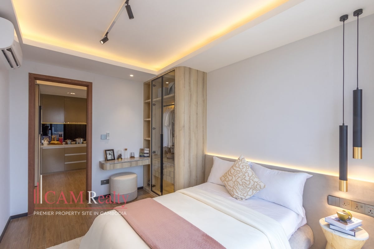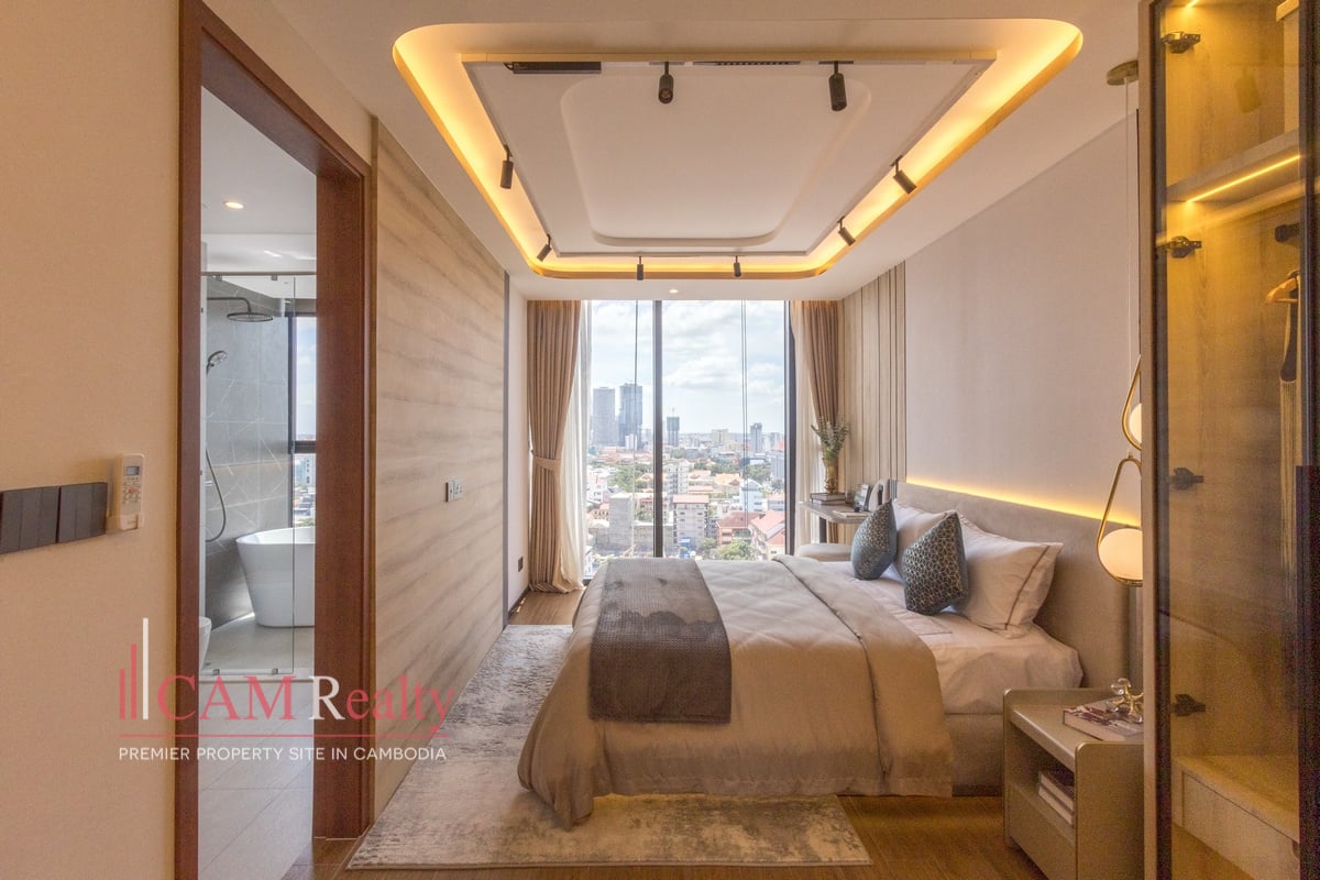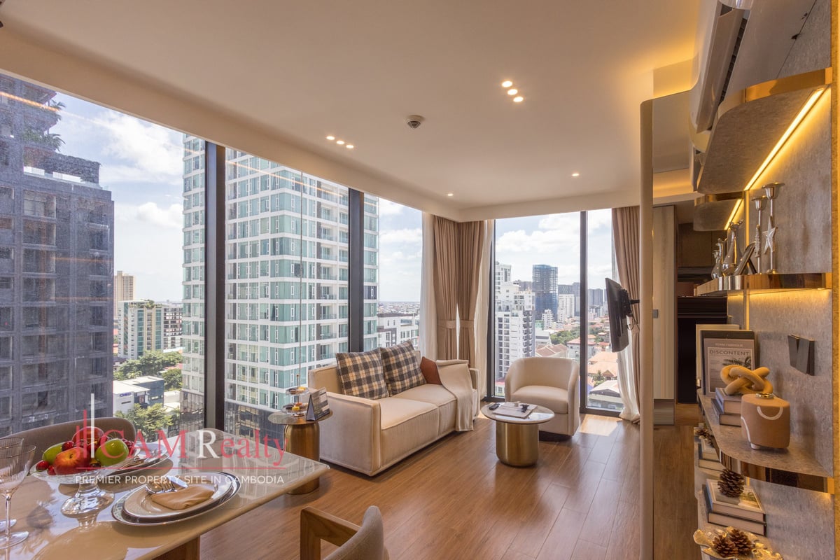 Residents enjoy access to world-class facilities, including a virtual gym, infinity pool, steam room, yoga studio, golf simulator, and kids’ playroom on the 7th floor. The 37th floor features a sky library, coffee lounge, meeting room, tea room, and sky bar overlooking Phnom Penh’s skyline.