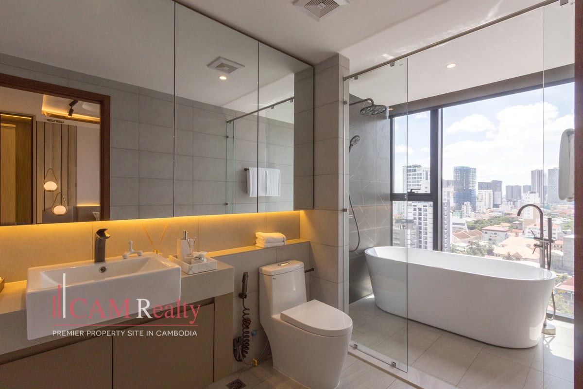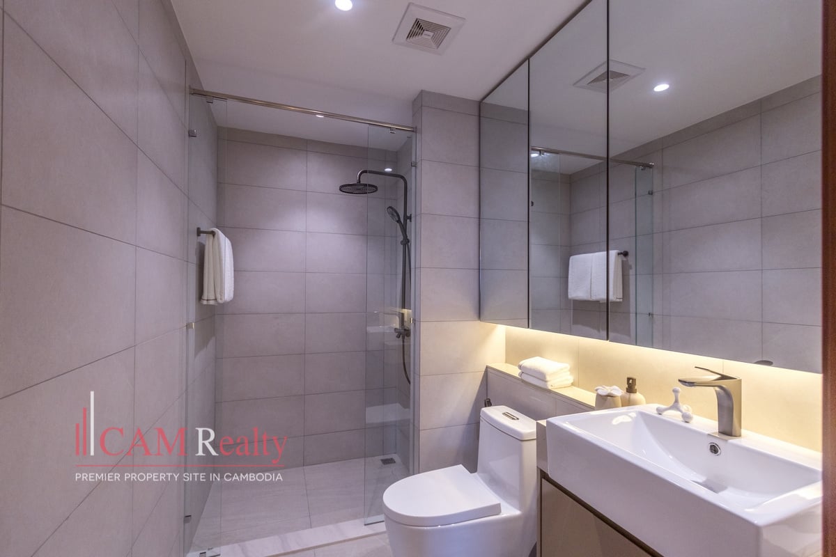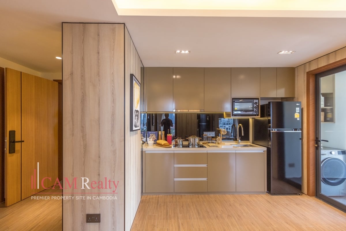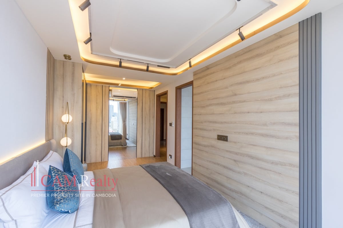 Residents enjoy access to world-class facilities, including a virtual gym, infinity pool, steam room, yoga studio, golf simulator, and kids’ playroom on the 7th floor. The 37th floor features a sky library, coffee lounge, meeting room, tea room, and sky bar overlooking Phnom Penh’s skyline.