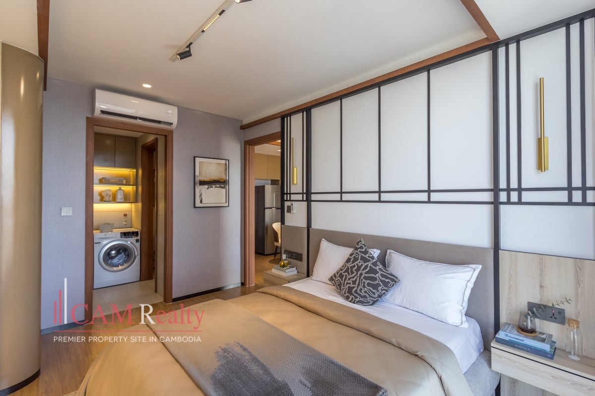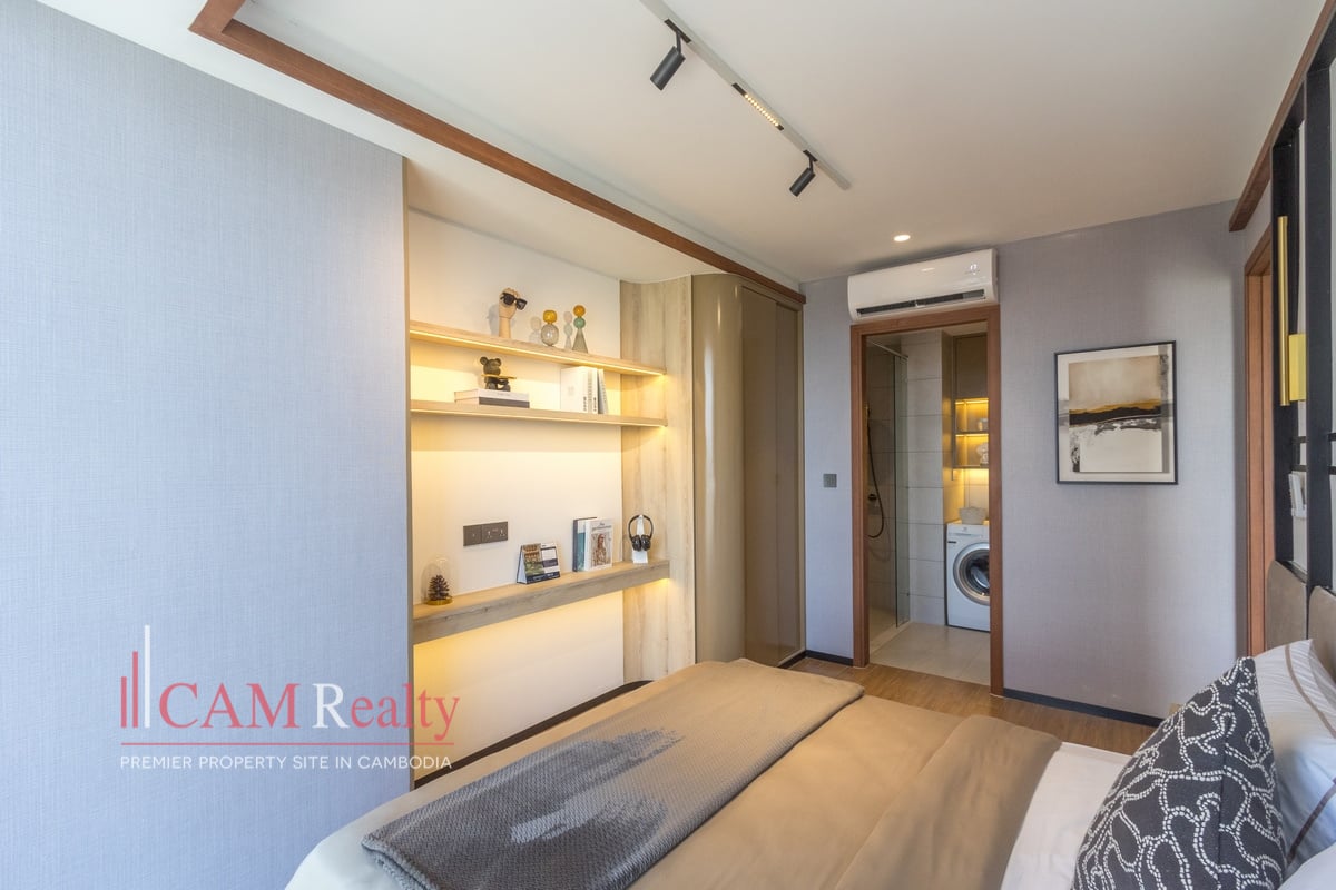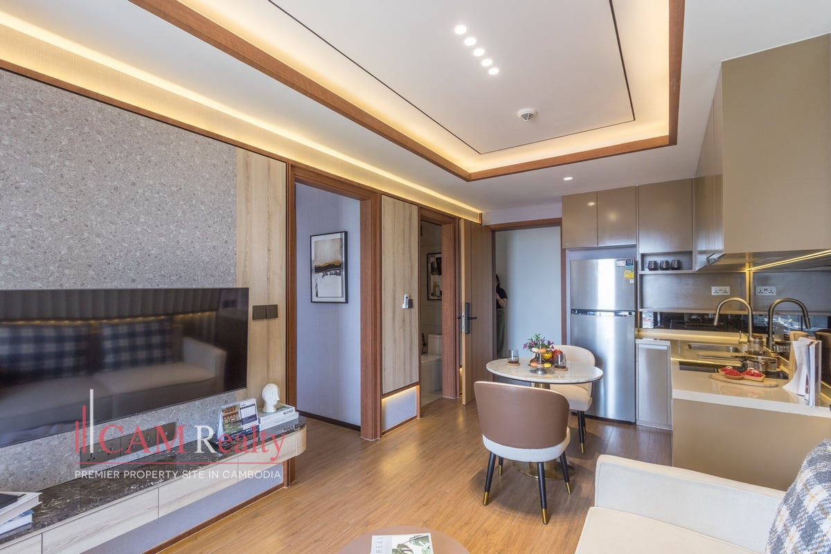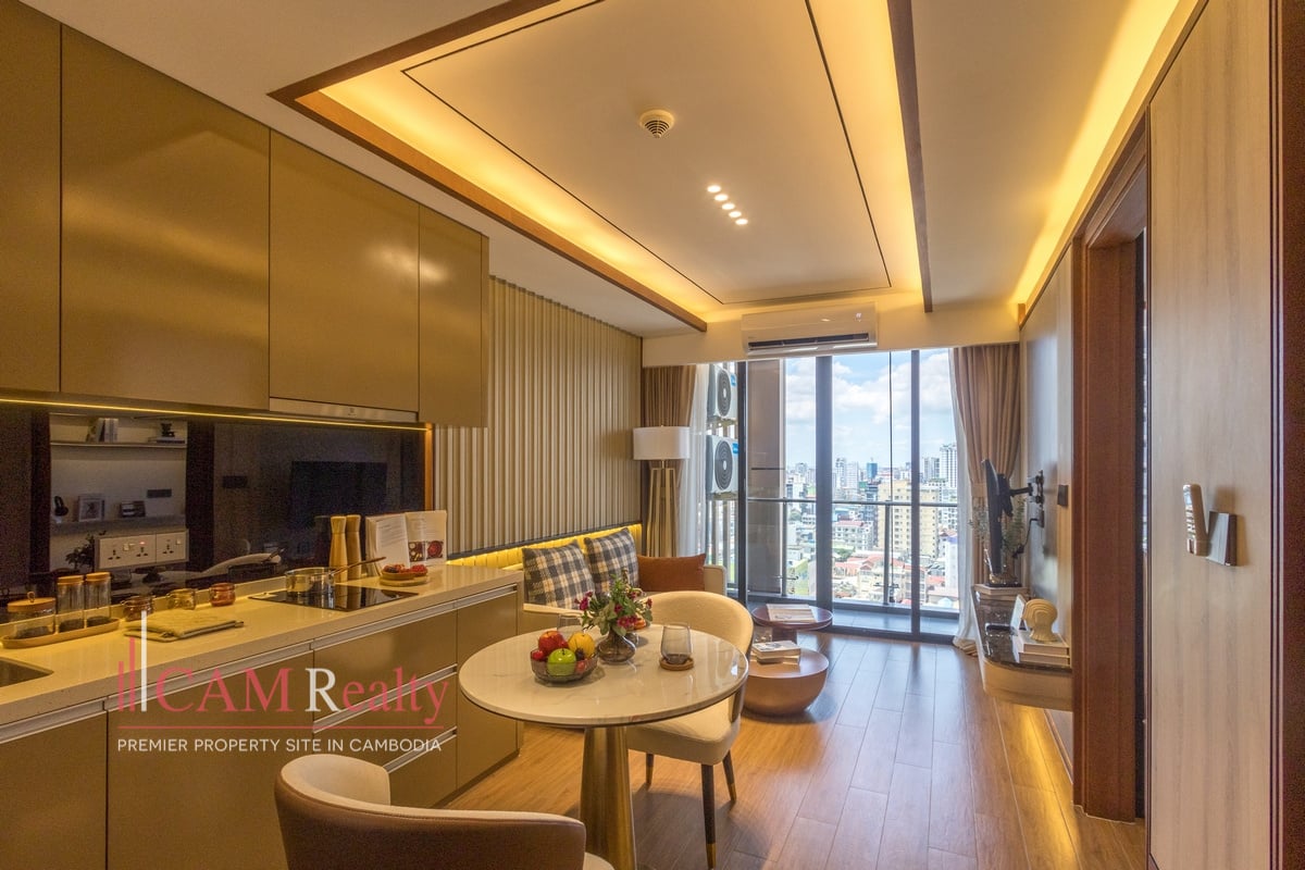Residents enjoy access to world-class facilities, including a virtual gym, infinity pool, steam room, yoga studio, golf simulator, and kids’ playroom on the 7th floor. The 37th floor features a sky library, coffee lounge, meeting room, tea room, and sky bar overlooking Phnom Penh’s skyline.