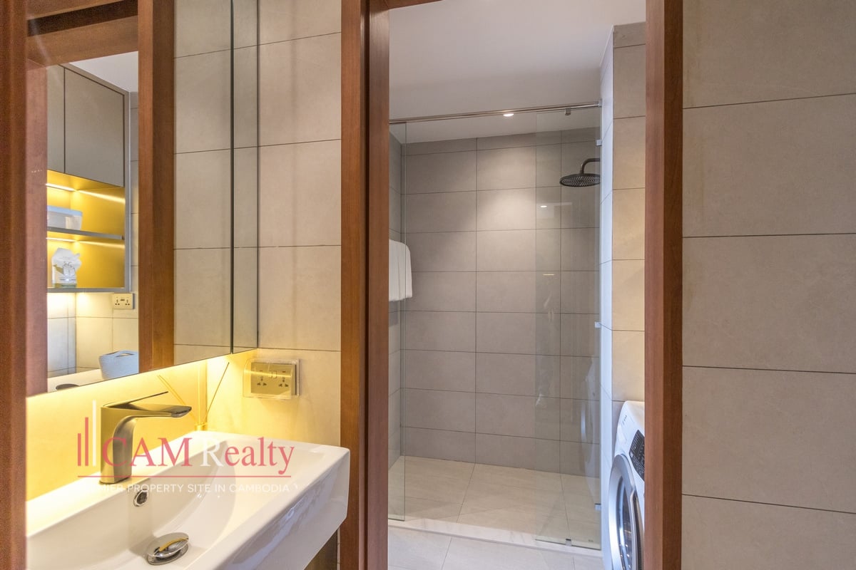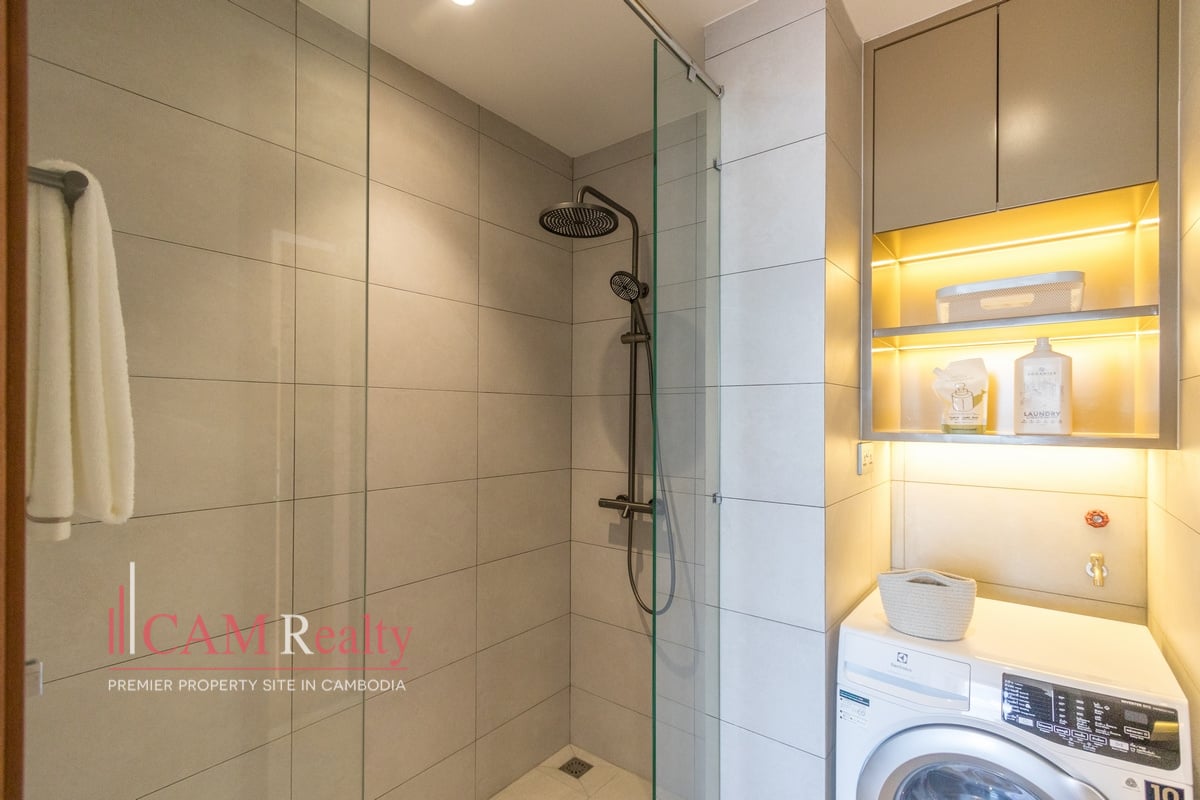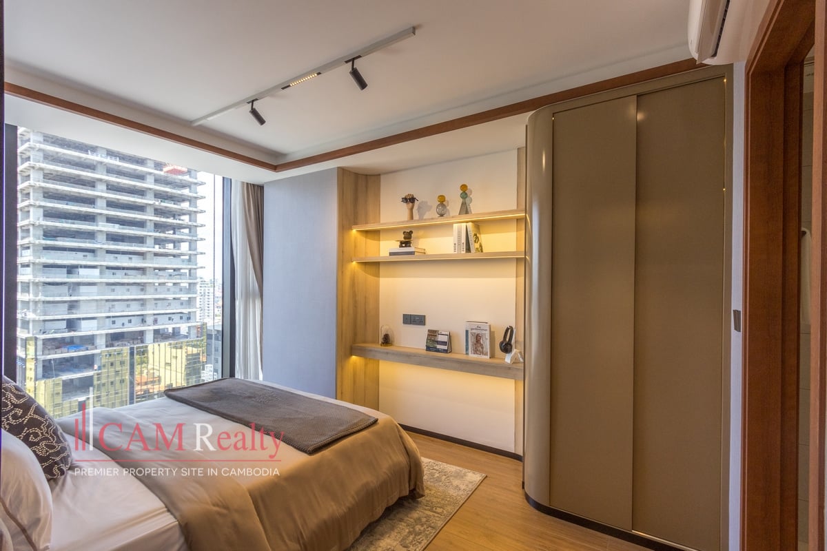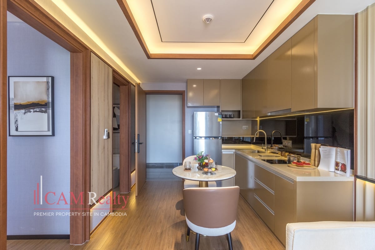 Residents enjoy access to world-class facilities, including a virtual gym, infinity pool, steam room, yoga studio, golf simulator, and kids’ playroom on the 7th floor. The 37th floor features a sky library, coffee lounge, meeting room, tea room, and sky bar overlooking Phnom Penh’s skyline.
