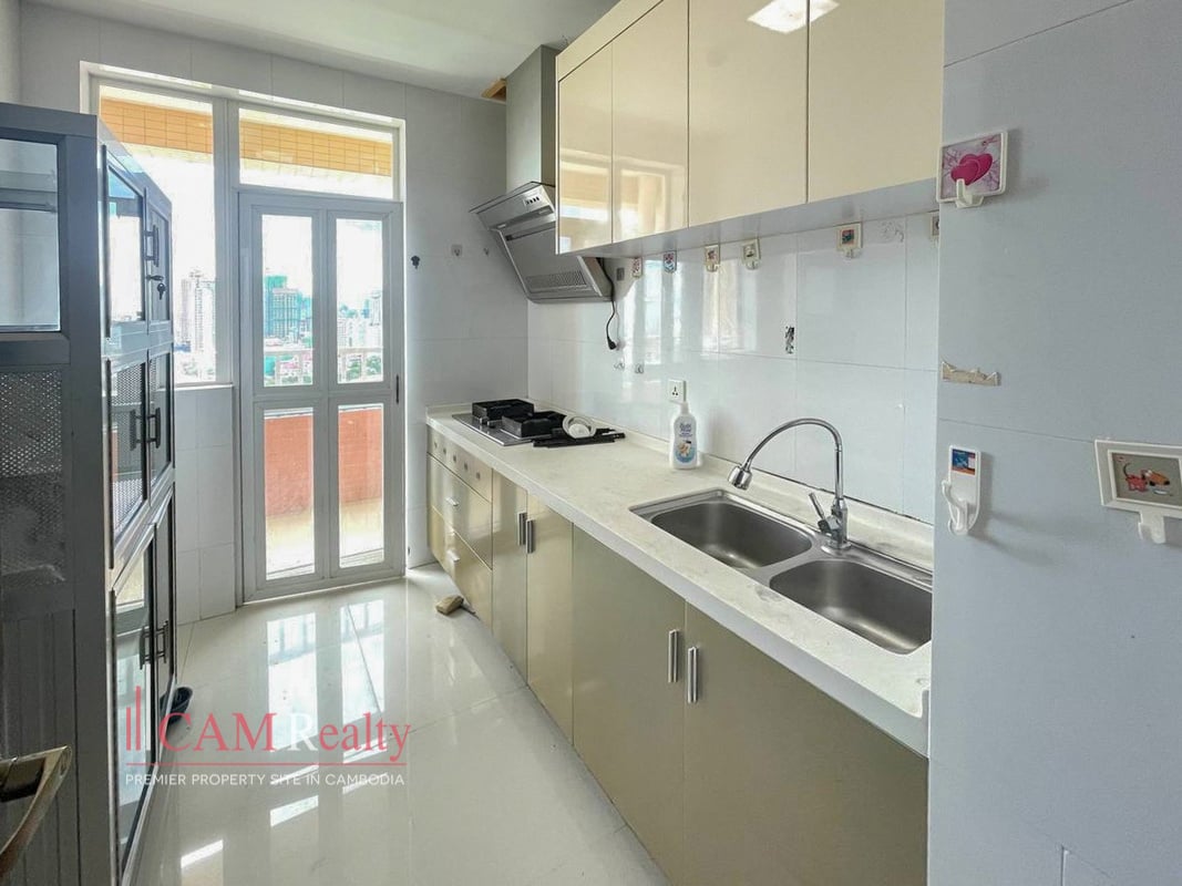 18th floor 3 bedrooms condominium for rent at Rose Condo in Tonle Bassac – Phnom Penh. This 194.08 sqm apartment comes with a full fixed set of furniture. It comprises a spacious living room, with a wide balcony that overlooks both the city view and river view, a closed-door kitchen, 3 bedrooms, and 3 bathrooms.