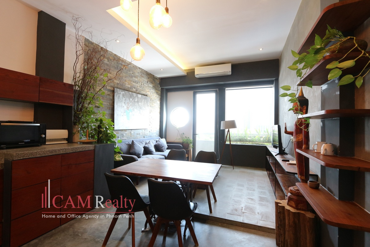 Western style 1 bedroom serviced apartment for rent Southern of BKK1 area, Phnom Penh. This western apartment is located in green area and quiet street. Just walking distance 10 minutes from BKK1 area and drive 8 minutes from Aeon Mall. This apartment attached with beautiful rooftop terrace and Jacuzzi on the 6th floor.