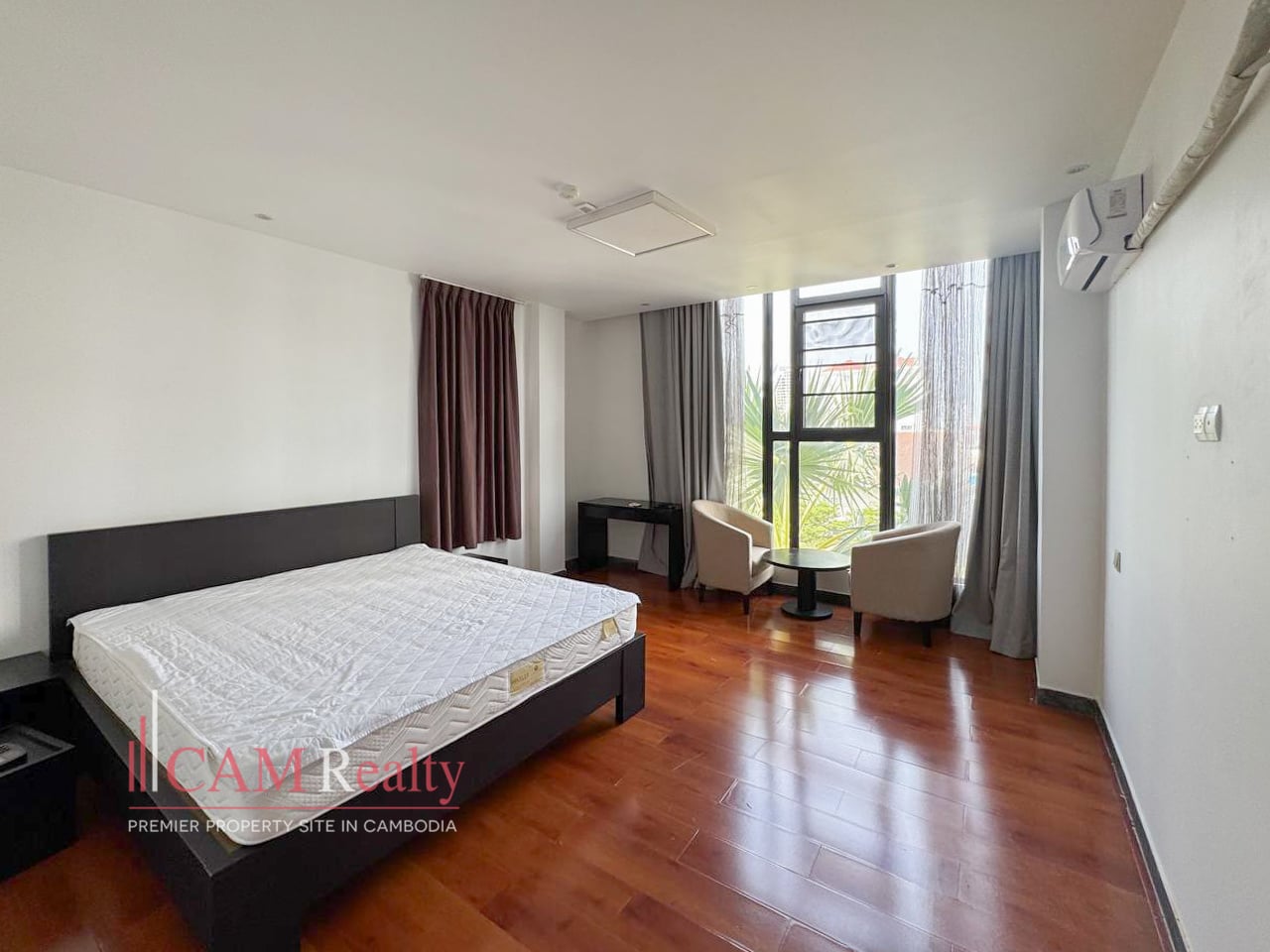 3 Bedroom Serviced Apartment For Rent in Southern Tonle Basak (Border BKK1). This modern serviced apartment locates in quiet, clean and green area at southern BKK1. This nice complex come with rooftop swimming pool, nice equipped gymnasium, steam & sauna room. You will spend less than 6 minutes from Independence Monument, less than 5 minutes from Aeon Mall.