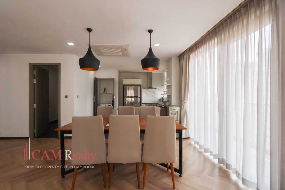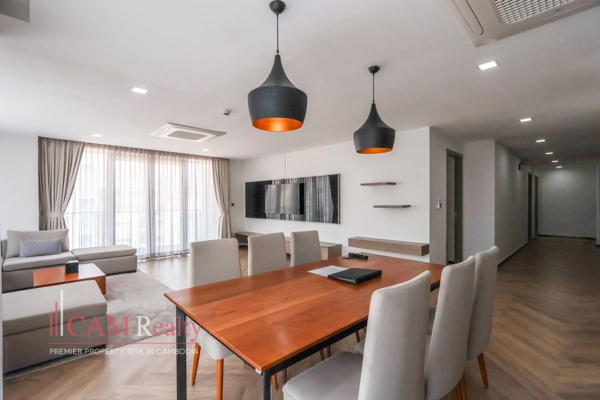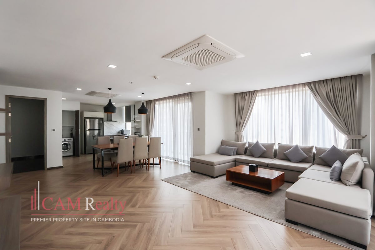 3 +1 Bedroom Serviced Apartment For Rent in BKK1. This spacious 180 sqm 3-bedroom serviced apartment is located in Phnom Penh’s most vibrant district—BKK1. Just steps from UNDP, Harrods International School, and Chip Mong Noro Mall, it offers unmatched city convenience.