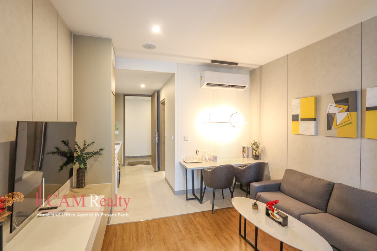 1 Bedroom Condo For Rent in Vue Aston. This condo features one bedroom, two bathrooms, a cozy living room, and a fitted kitchen. Fully furnished with stylish interiors, it’s ideal for professionals, couples, or anyone seeking a compact yet functional home in Phnom Penh.