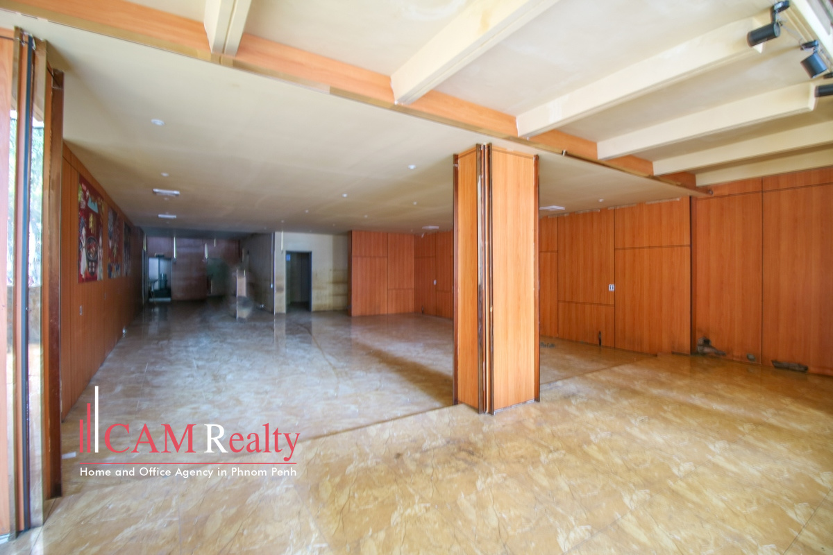 12 Rooms Commercial Space For Rent in BKK1. It spans 696 sqm. The layout includes 12 rooms and six bathrooms. The open design is ideal for a restaurant. Large frontage ensures visibility. High ceilings enhance the spacious feel.