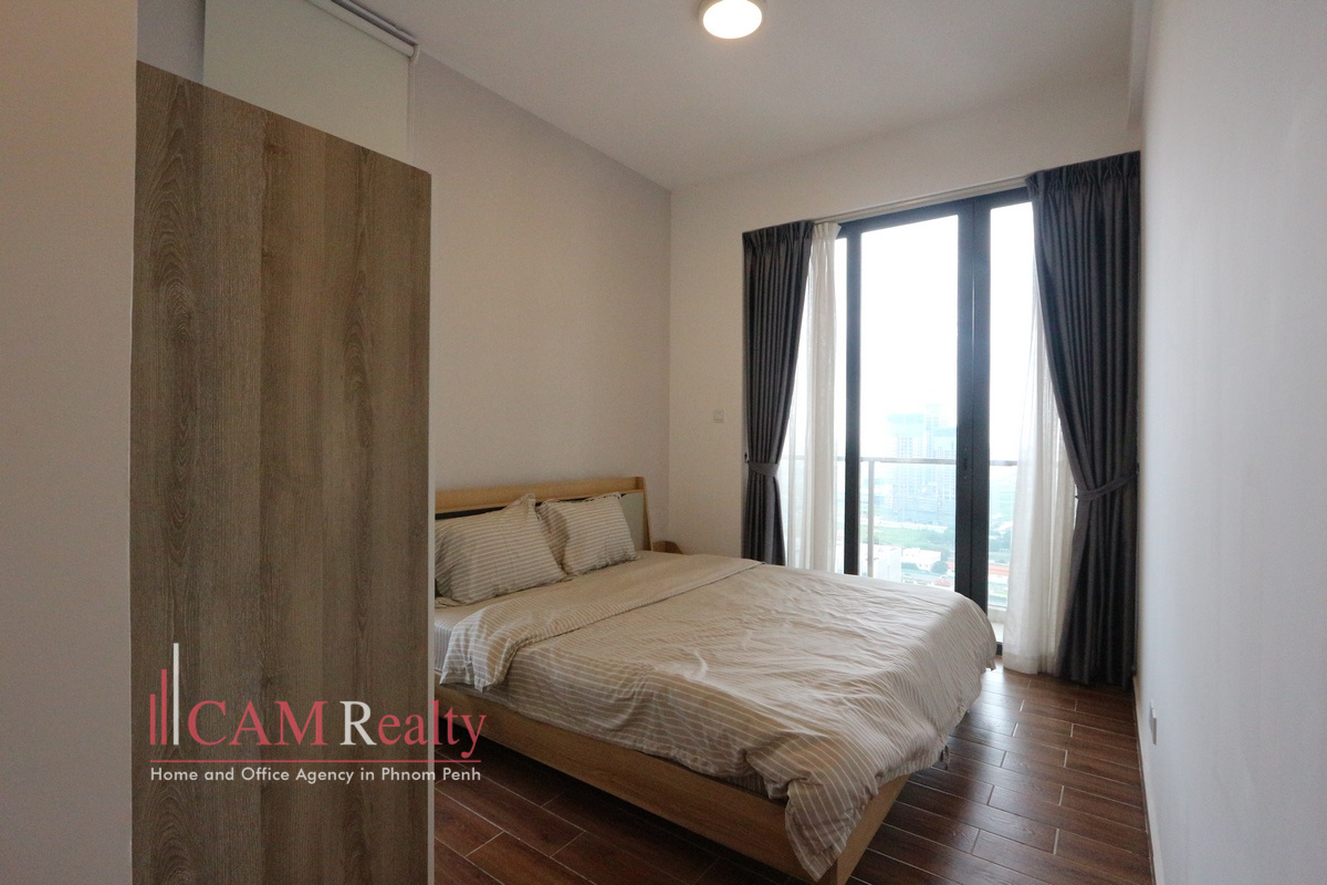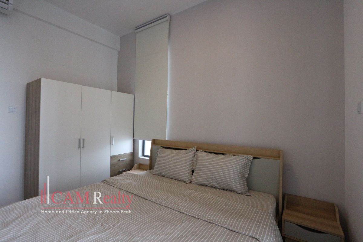 Modern style 2 bedrooms apartment for rent. This nice apartment locates 5 minutes drive from Canadia Tower and Vattanak Tower along Kampuchea Krom Blvd. This big complex come with beautiful swimming pool with nice terrace, fully equipped gymnasium & sauna room.