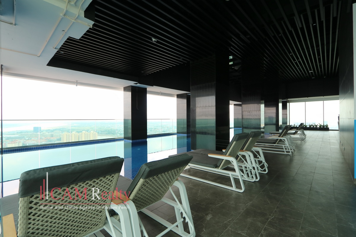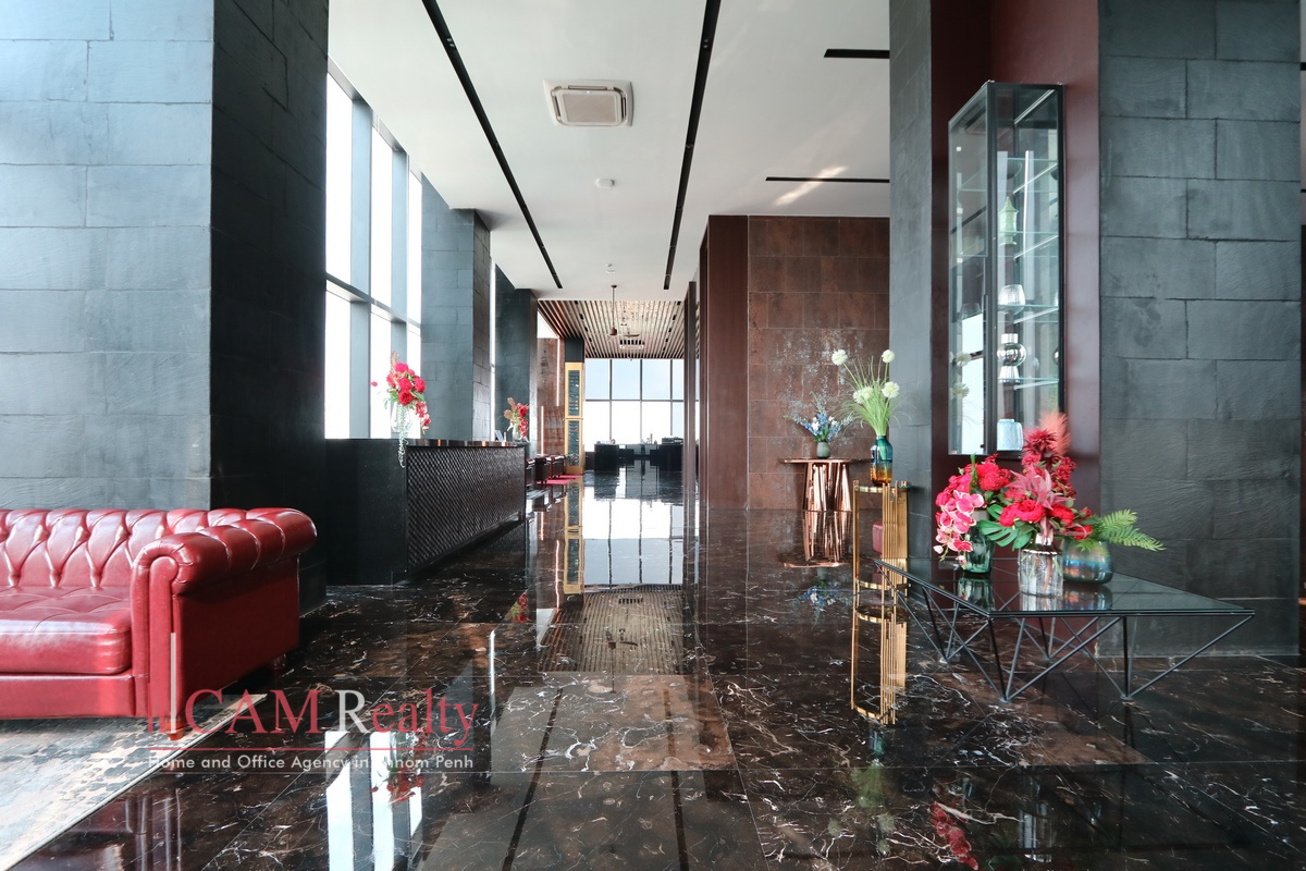 2 bedrooms apartment for rent in BKK1 area, Phnom Penh. This apartment measures 65 square meters and inclusive fully furnished, 4 elevators, security guards, CCTV security, internet(Wi-Fi), table pool, table tennis, kit playground, motor parking, and plus access to facilities usage(Indoor pool on 41st floor, Gym, and 42nd floor; Sky bar and outdoor pool). The apartment is located in Sangkat Beong Keng Kang 1, Khan Beong Keng Kang, Phnom Penh. You will spend 5 minutes driving’ to Aeon Mall Phnom Penh, 7 minutes drives’ to Independence Monument, 7 minutes driving to the Canadian International School of Phnom Penh (Koh Pich), 10 minutes driving to Royal Palace Park, and 12 minutes driving to Central Market Phnom Penh.