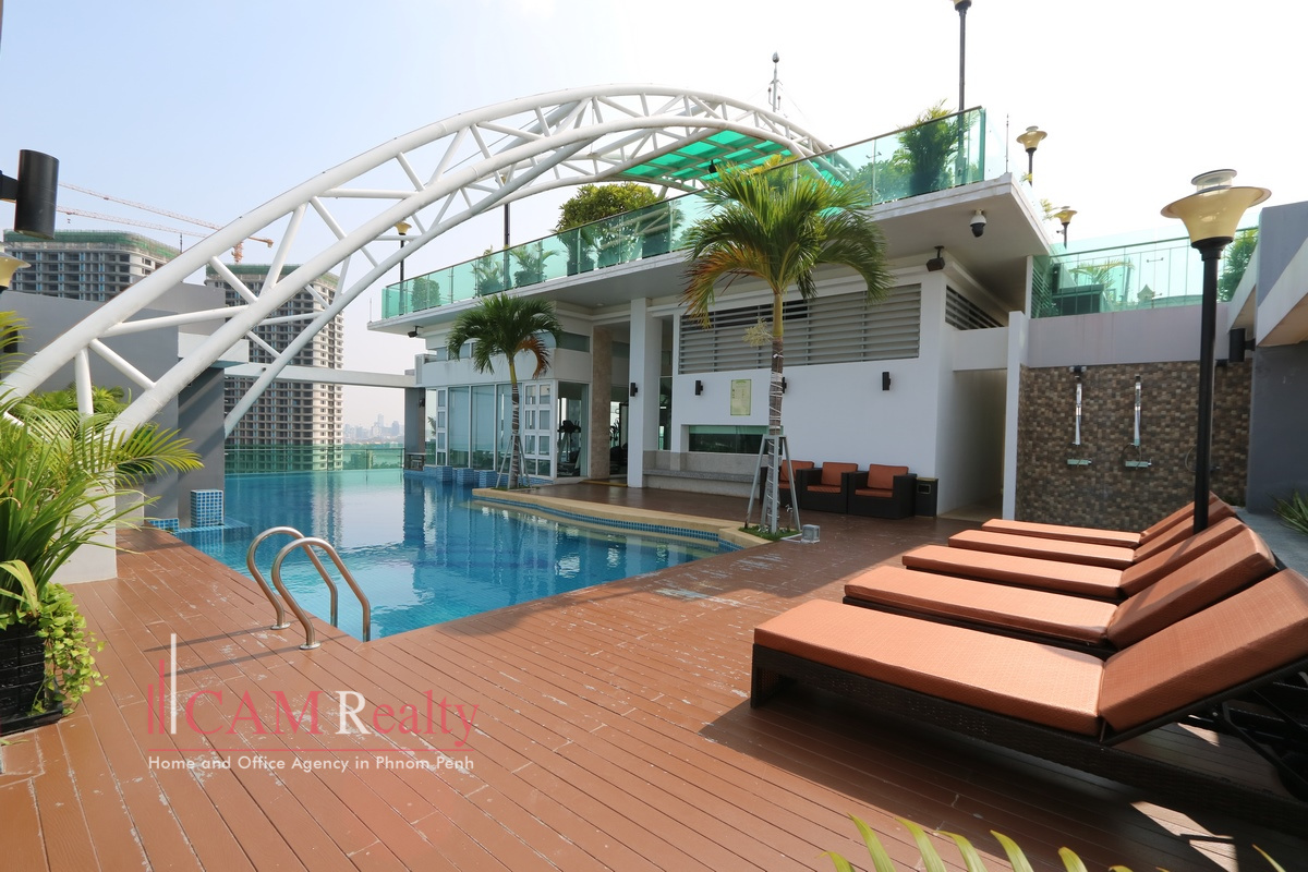 Rooftop swimming pool with pool for kits, nice gymnasium, and beautiful- rooftop terrace with a great view of the Mekong river.