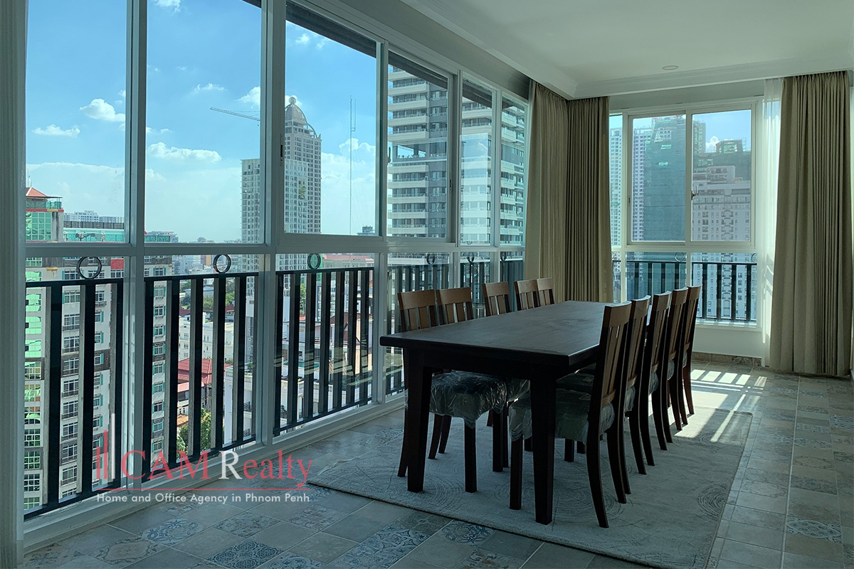 Spacious traditional style 4 bedrooms penthouse apartment for rent in BKK1 area. This penthouse sits on 14th floor of the building – measuring 325 sqm. It consists of 4 bedrooms and 5 bathroom – each comes with glass separating wet and dry area. The living halls comes with a complete lounge set next the kitchen. This penthouse for rent is located in Sangkat Boeng Keng Kang Ti Muoy (1), close to Independence Monument, which is known as the most lively commercial rea and very popular among expats as it is in lined with supermarkets, embassies, international schools, modern restaurants and coffee shops.