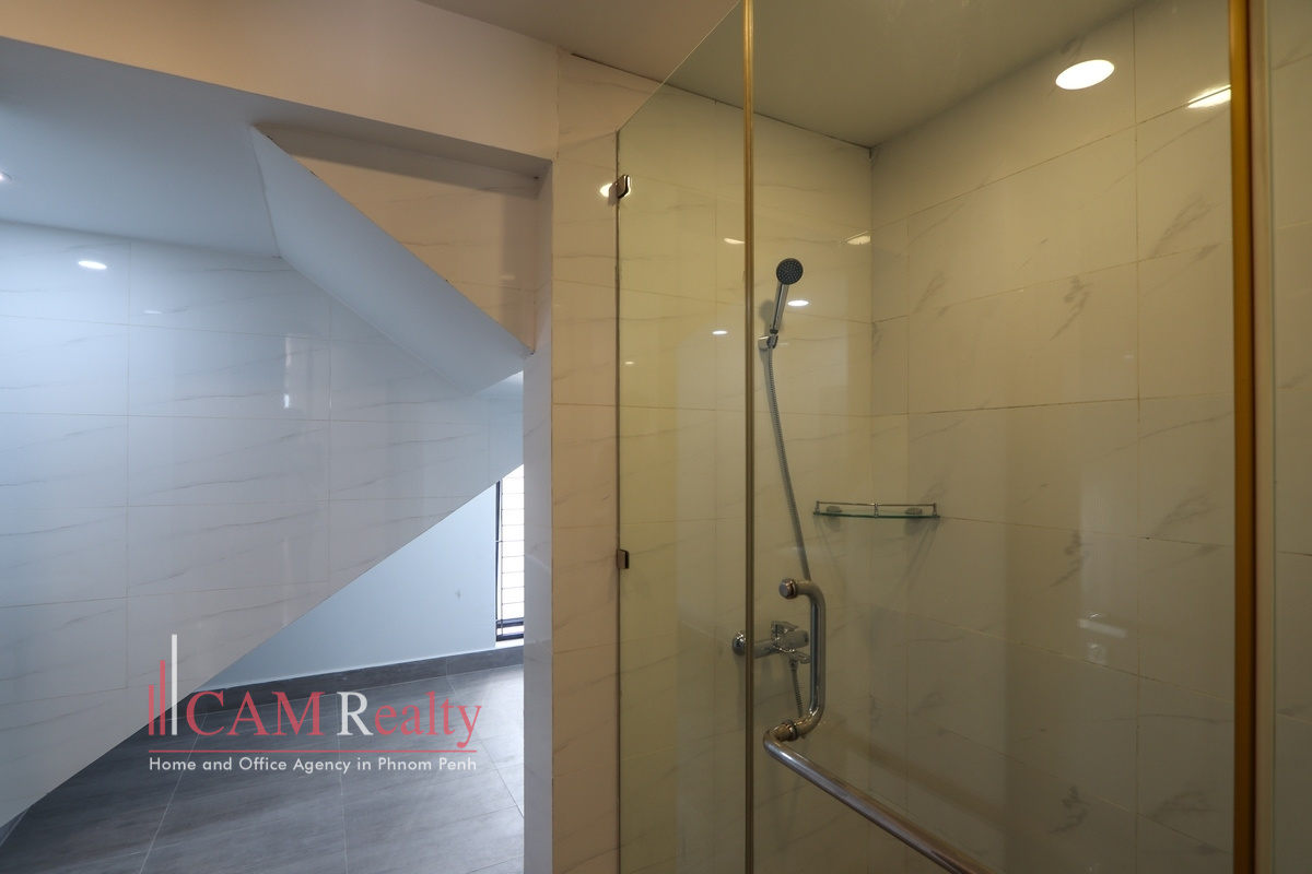 Modern style fully-furnished 5 bedrooms villa in gated community for rent in Vattanac Tower area, Phnom Penh. It located in a very safe community with 24/7 security at the entrance. Just a few minutes stepping outside of the community, you reach out to supermarkets, convenient stores, the popular Vattanac Tower, Canadia Bank tower, sport center, etc.