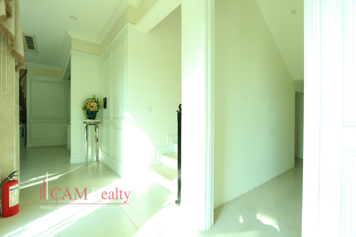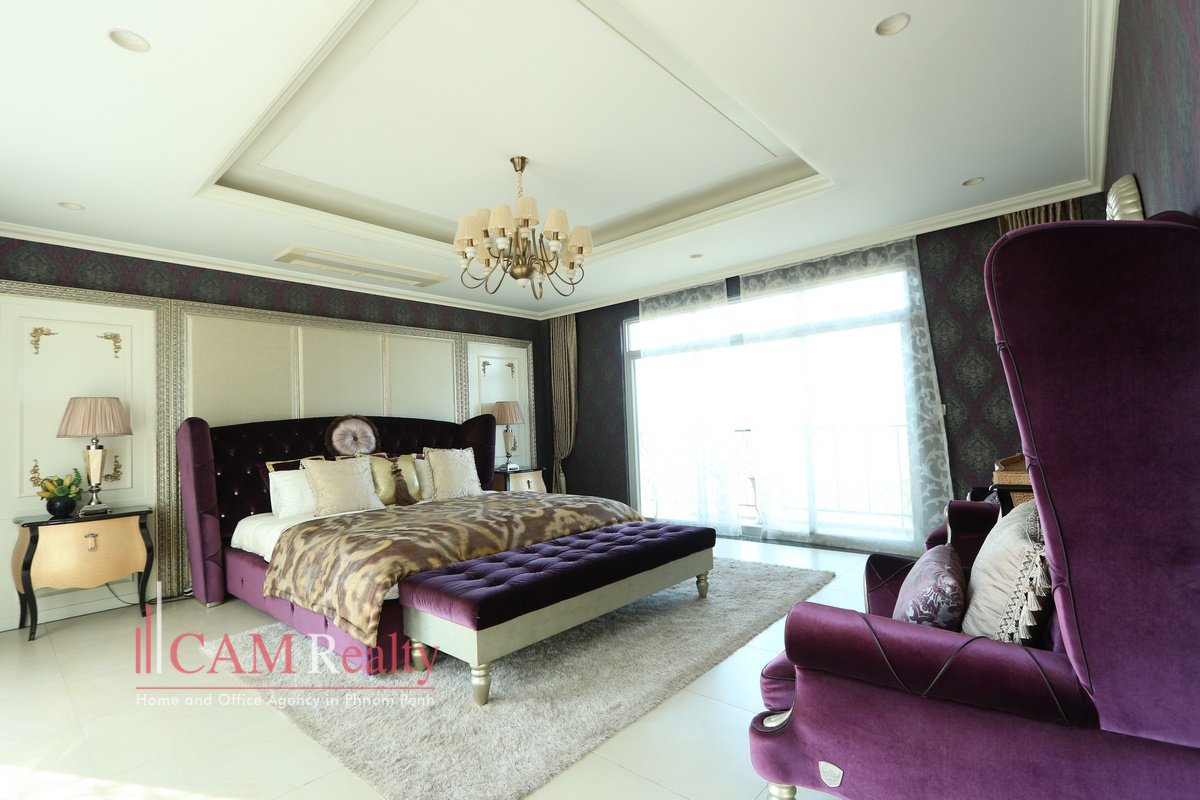 6 Bedroom Emperor Villa For Sale in Camko City. This villa comes in 3 storeys – consisting of two living halls, spacious kitchen, 6+1 bedrooms that each comes with double sized beds with desk and wardrobe, 7.5 bathrooms. Moreover, it comes with a private elevator. Located in Camko City, Sangkat Tuol Sangke, Khan Russei Keo, Phnom Penh. 5 minutes from TK avenue, 3 minutes to supermarkets, coffee shops, restaurants & 10 minutes to Aeon Mall Sen Sok city.