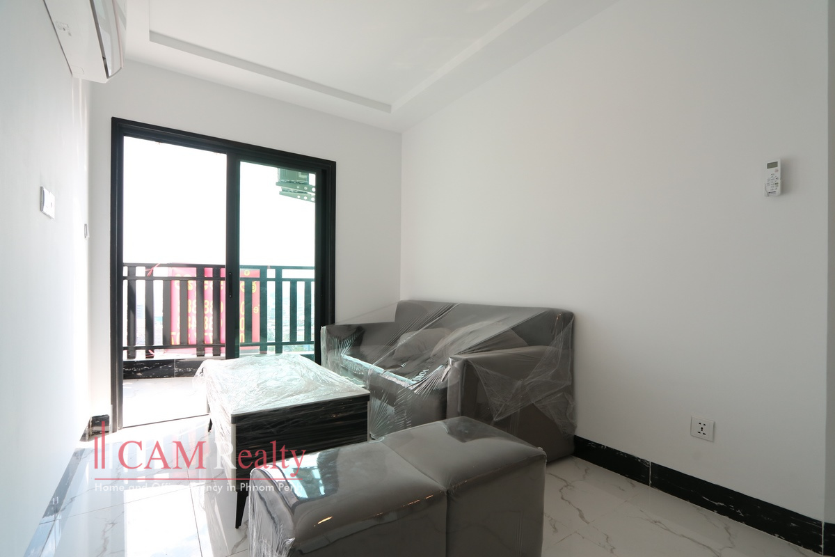 Brand new 1-bedroom apartment on 22nd floor for rent in 7 Makara area – Phnom Penh. The unit has a creative utilization of space and made it feel more open and ample. They fit a good-sized open-plan living room with a small kitchen, 1 bedroom, 1 balcony, and 1 bathroom with glass that separates wet and dry areas in this 42 sqm unit.