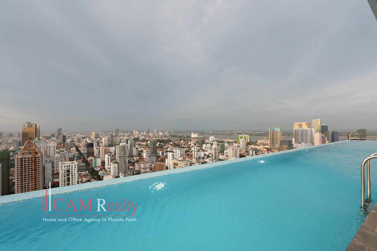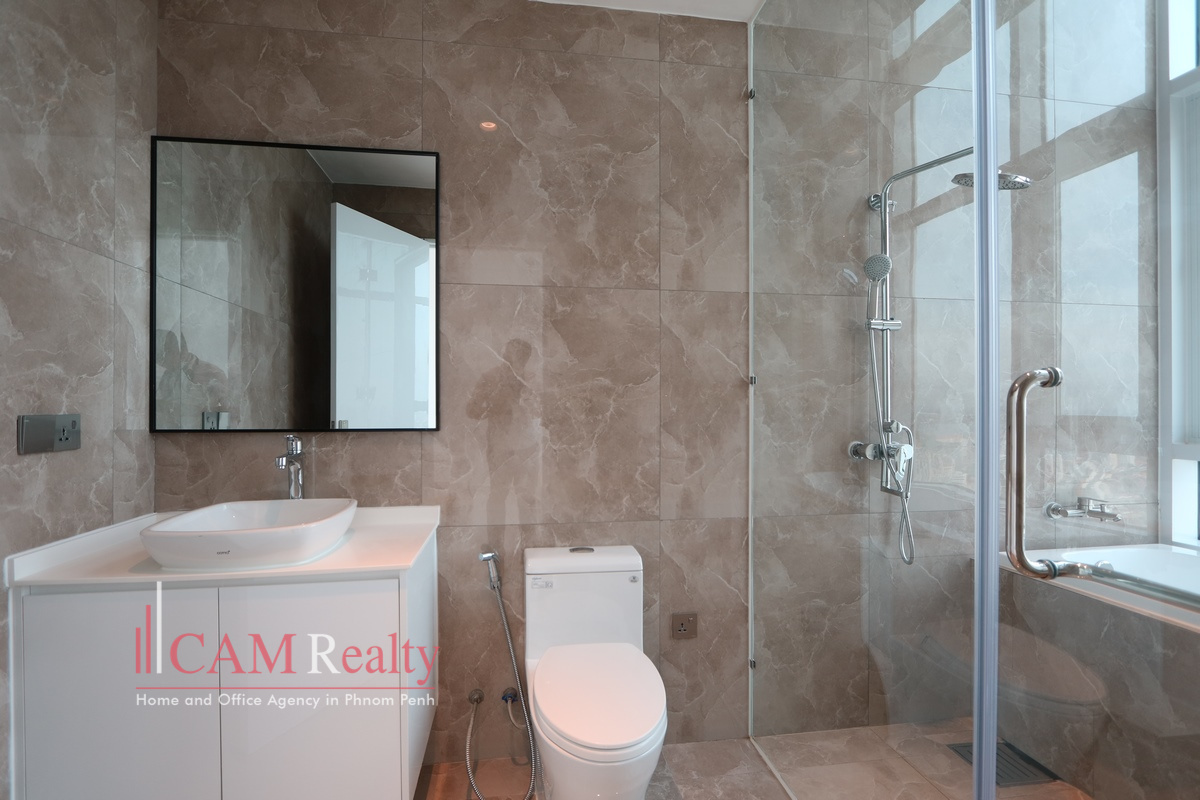 3 bedrooms penthouse condominium on the 40th floor for sale in BKK1 area – Phnom Penh. This 153 square meters condominium comprises a living room with an island desk kitchen that offers a wide panoramic city and river view, with 3 bedrooms and 3 bedrooms. Plus, the master bedroom is exceptionally spacious and has a big private balcony attached. Both master and secondary bedrooms – each has an en-suite bathroom with a bathtub. Whilst its standard bedroom has access to the shared bathroom. In addition, the unit has a tall ceiling that offers you a sense of space and makes you feel ampler.