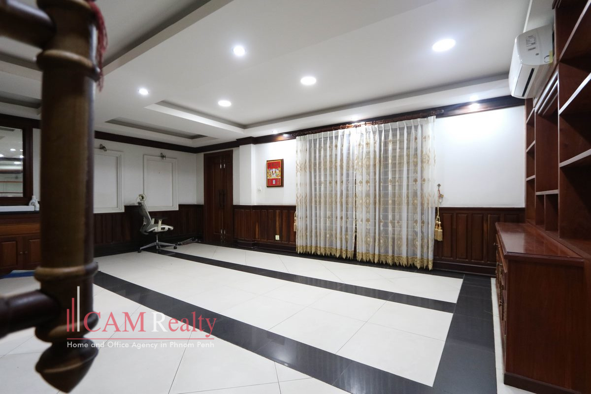 11 Bedroom Villa For Rent in BKK1. This building is in the BKK1 area, which is the busiest commercial district in the capital city that results in convenience for both residences or being used as office headquarters, institutes, or an international school. The house comprises 5 floors – features 11 bedrooms each comes with an emergency exit. Located 350m from Amass Central Tower, 650m from Independence Monument/ Invictus International School, 850m from Chip Mong Noro Mall, and 6.3km from TK Avenue.