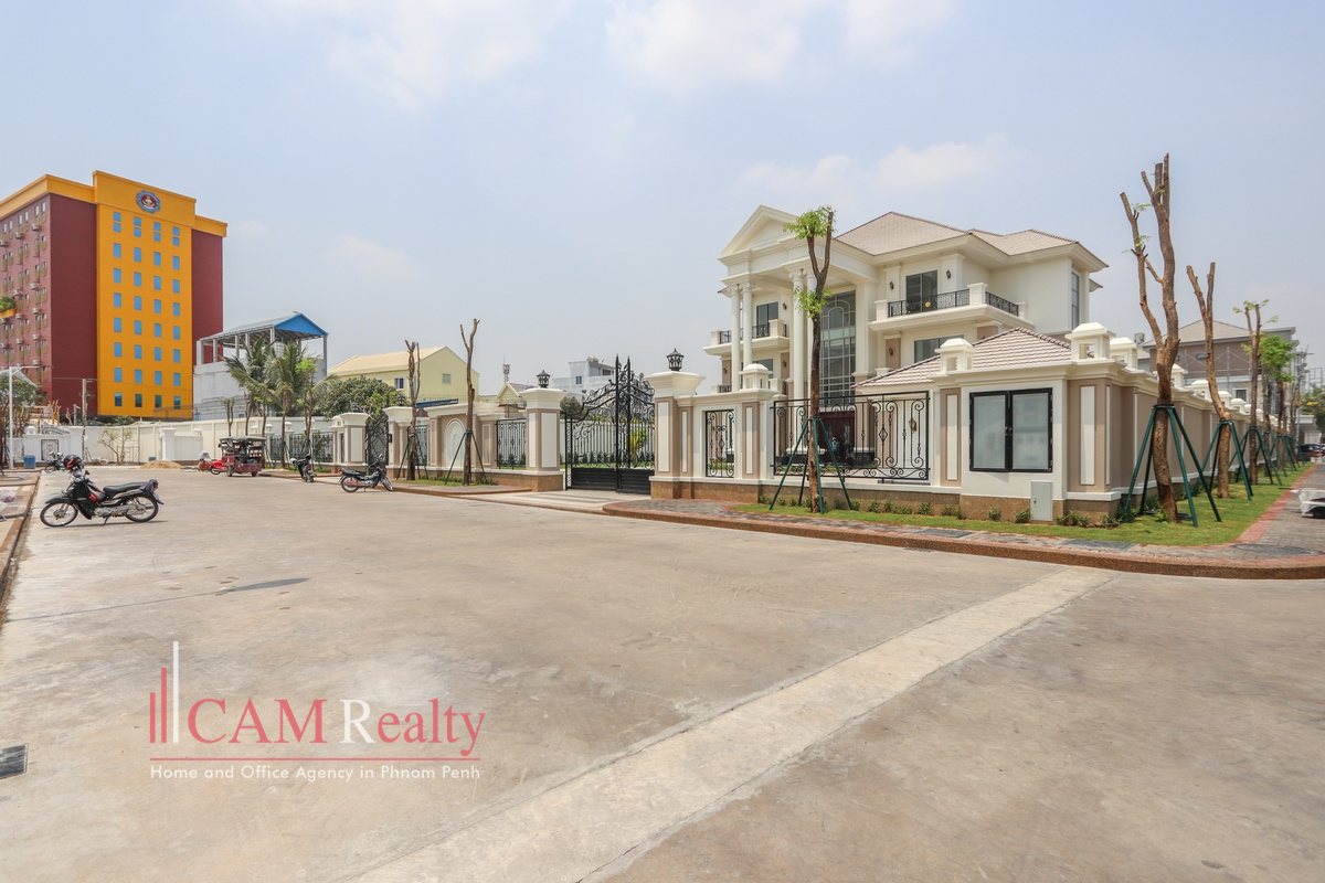 7 Bedroom King Villa For Rent in Peng Huoth The Star Diamond. This villa sits on land of 2,030 sqm and floor area of around 1,039 sqm with 3 storeys. It features a large open-plan living room, a big kitchen with pantry cabinets, and 7 bedrooms with 8 bathrooms. Meanwhile, this house also offers a large front yard and large parking spots.