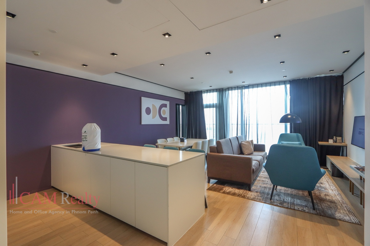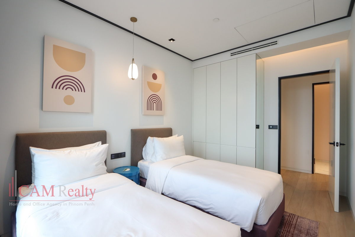 High-end 2-bedroom serviced apartment for rent in Eden Garden area – Phnom Penh. This 99 sqm luxurious serviced apartment contains a spacious open-plan living room with a complete lounge set and a smart TV that you can watch your favorite shows. Along with that, they set up the kitchen in a single-wall style and an island desk with a range hood, electric hops, oven, and built-in cabinets to store groceries. Both bedrooms come with a consequent bed and closet – the master bedroom contains an en-suite bathroom with a bathtub, whereas the standard bedroom has access to the shared bathroom with a glass-enclosed separating shower from the vanity top sink and toilet.