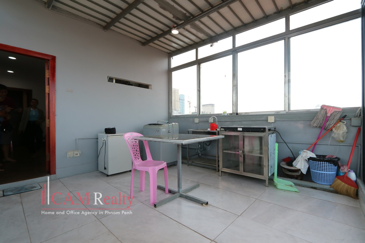 Studio apartment for rent in Daun Penh area – Phnom Penh. This apartment is on the 5th floor in a townhouse in Sangkat Phsar Thmei Ti Bei, which is only a few minutes’ walks from the Riverside area where restaurants, coffee shops, grocery stores, and local markets take place. The unit measures around 40 square meters–contains one living room with basic furniture. It attaches a big private terrace that faces the relaxing city view.