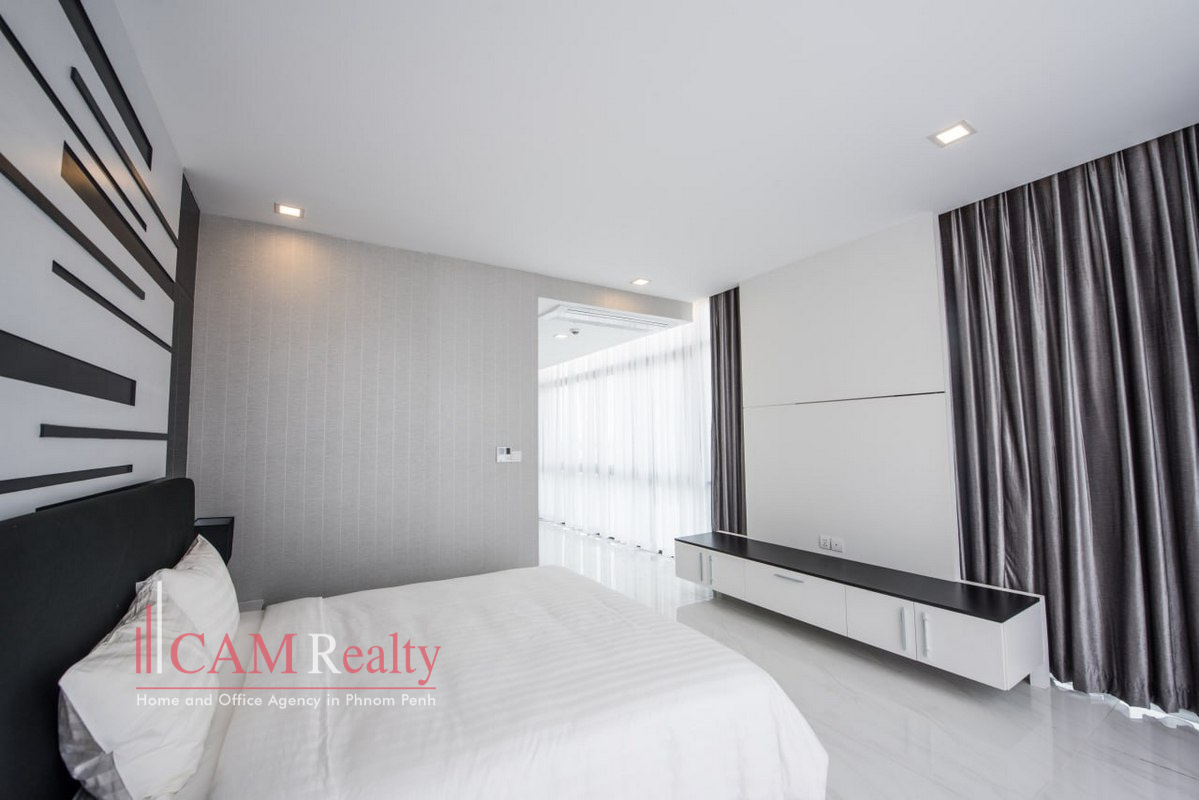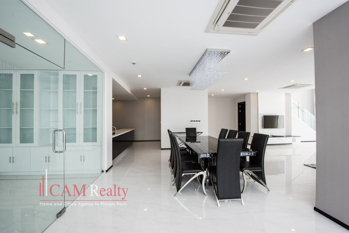 5 Bedroom Duplex Penthouse Serviced Apartment For Rent in Daun Penh. This penthouse offers a luxurious living experience. Fully furnished, it includes modern amenities and stylish interiors. The apartment features a safe deposit box, flat-screen TV, and a fully equipped kitchen.