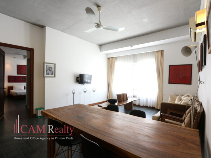 Toul Sleng area| Modern style 1 bedroom serviced apartment available for rent in BKK3 area near Toul Sleng Genocide museum, surrounded by quiet, nice and safe environment. It locates in the the middle of city which close to market, super market, modern coffee shops, pubs, international school, bus terminal..etc.