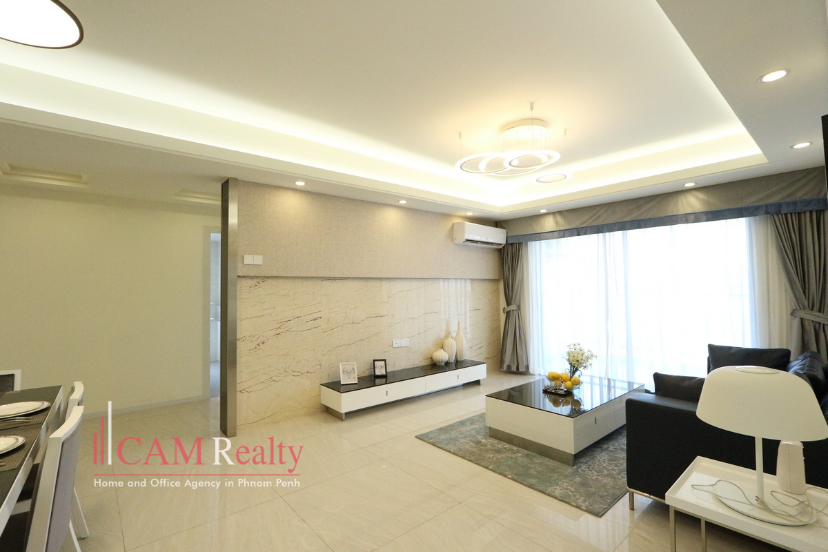Modern style 3 bedrooms condominium for rent. This building locates in quiet and clean area of Toul Kork, 5 minutes drive from Toul Kork Market and 2 minutes drive from TK Avenue. This complex comes with beautiful garden pool & gym and big public garden.