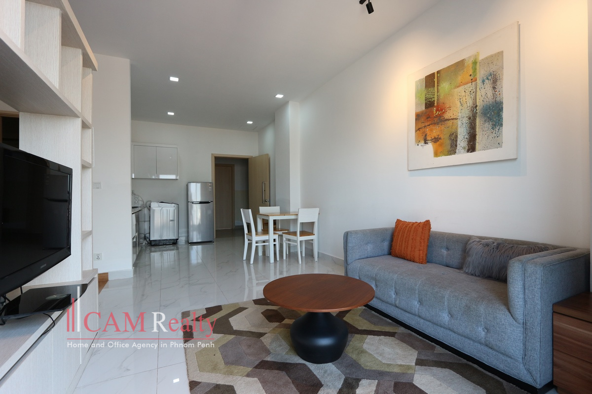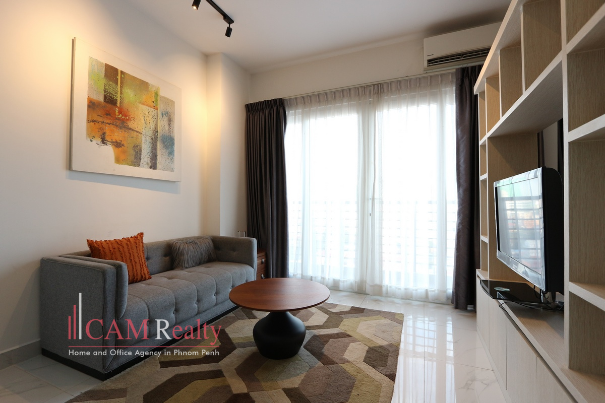 Modern style studio condo unit for rent in Boeng Tumpun area, South-west part of Russian Market (Tuol Tompoung), Phnom Penh. This condominium is located in a quiet area and only 6 minutes drive away from the popular Russian Market. The building comes with a beautiful rooftop swimming pool, playground, fitness center, steam & sauna.