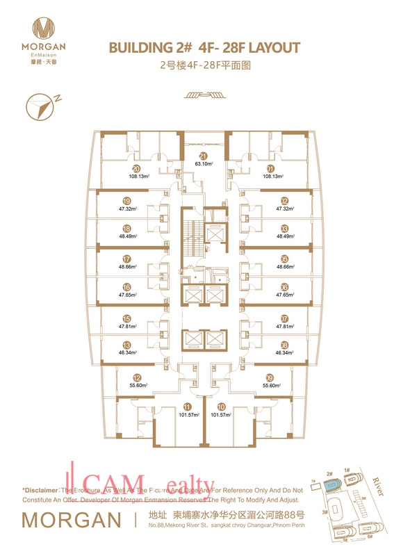Morgan EnMaison, which is located on Mekong River Road in Phnom Penh’s Chroy Changvar district, which is known as the best city project is set to be a riverfront landmark by the Morganford Investment (Cambodia) Co., Ltd. There will even be a private helipad on the 220-metre high rooftop.The Morgan EnMaison complex boasts five modern buildings sitting in a U-shaped distribution on a land area of 2.5 hectares. This special feature allows Morgan Buildings face with spectacular river and city view at the same time. The most special feature of Morgan is fresh air from river and brightening from the beautiful view and healthy atmosphere makes living condition better. In brief, It also 200m sidewalk along the riverside and 16 minute from independence monument area. Morover, the Morgan are the prime area of phnom penh, from BKK1 18 minute, from Toul Tomomg Market just spend 28 minute and from phnom penh international airport 40 minute. Especially the Morgan EnMaison have the own port in the river and suitable for all people who love peace.