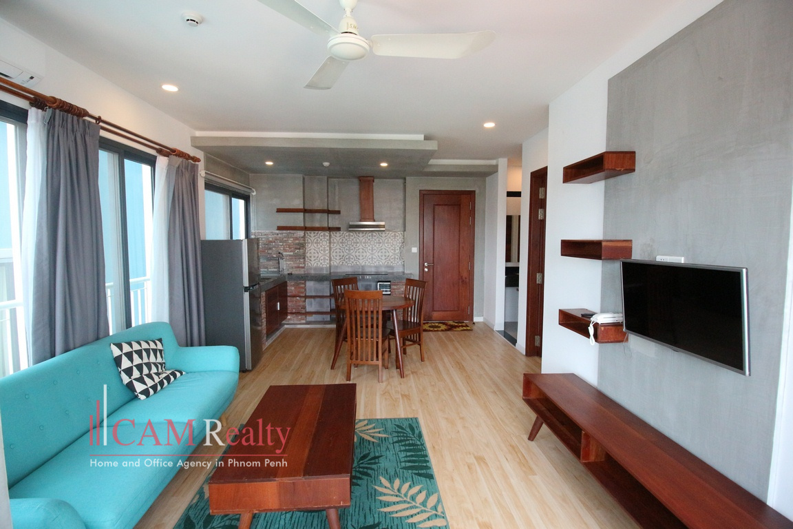 1 Bedroom Serviced Apartment For Rent in Phsar Daeum Thkov (South of Russian Market). It is located in Sangkat Phsar Derm Thkov near Russian Market area. This modern western style apartment comes with lightening living room combined with kitchen and dining space. A private balcony attached in bedroom. This apartment comes with fully equipped gym, steam and sauna room.