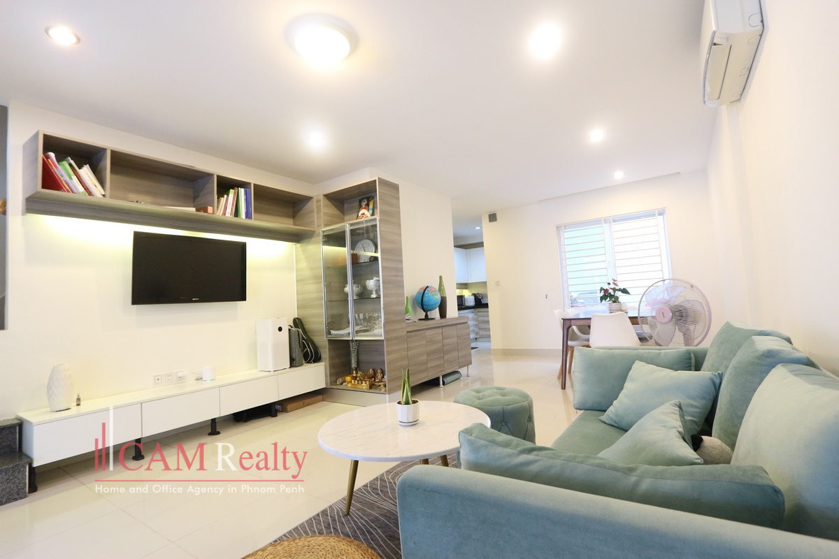 Fully furnished 3 bedrooms link house in gated community along National Road 1, Phnom Penh for rent. This house is located in a green and undisturbed area with 24/7 security guards on duty. It is very good for long term stay for work and business. It takes only 15 minutes drive to BKK1 and Aeon Mall Phnom Penh. Mini-marts, restaurants, international school, coffee shops, commercial establishments are all in the neighborhood of this gated community.