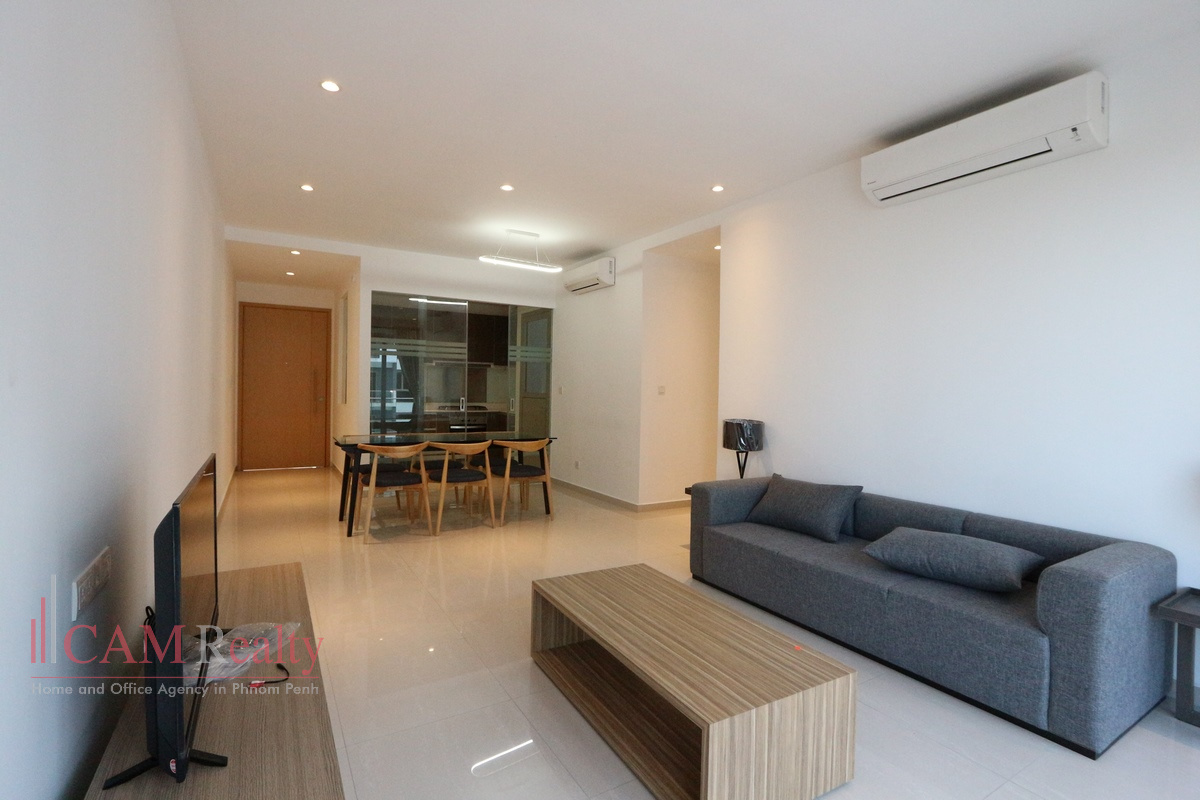 Modern style 3 bedrooms apartment for rent. This nice apartment locates 8 minutes drive from Phnom Penh International Airport at the east and 4 minutes drive from North Bridge international school. The complex comes with 3 swimming pool and one 50 meters length, big open jacuzzi next to the pool, fitness center, tennis court & basketball outdoor court.